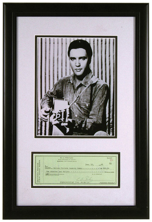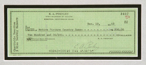 Personal check (8.25 x 3 inches), dated December 12, 1968, signed by Elvis Presley in black ballpoint pen. The check is made out to "Motion Picture Country Home" in the amount of $200 dollars and is signed E.A. Presley along the bottom. Presley checks are particularly rare. Only approximately 125 Elvis Presley checks are in collectors' hands, all of which have been released over the years by Graceland. The signature grades a "9" and the check is in Excellent to Near Mint condition. Matted and framed (14.25 x 21.25 inches) with an 8 x 10 black and white photo. LOA from James Spence, Steve Grad & John Reznikoff/PSA DNA. Reserve $500. Estimate $1,000/$2,000. SOLD FOR $2,610.00