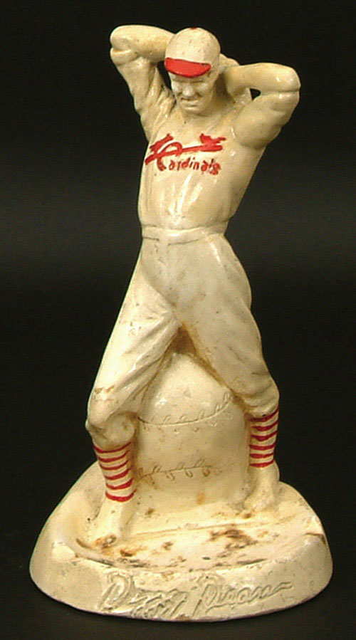1930s Dizzy Dean glazed ceramic figural ashtray features the great pitcher in full windup in his Cardinals uniform. "Dizzy Dean" appears on the front of the base for display. "Copyright applied for" is engraved on reverse. The figure is very striking, in white with red accents. A baseball with stitching provides support to the figure. There are very few figural pieces from the 1930s featuring specific ballplayers. This is the first time we have ever seen this unusual rarity dating from the glory days of the "Gas House Gang." The figure stands 10 inches tall. Some burn marks in the ashtray section related to use as intended, otherwise in Excellent condition. Reserve $200. Estimate $400/$800. SOLD FOR $2,204.00