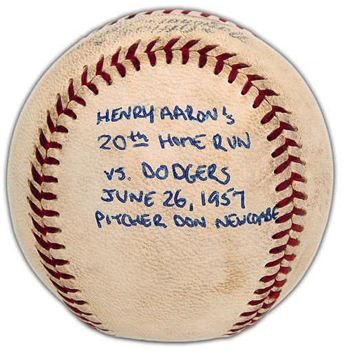 Presented is the actual baseball that Hank Aaron hit for the 20th home run of his M.V.P. 1957 season off of Dodgers' pitcher Don Newcombe. This was only the 86th home run of career. Of course, 1957 was also the year in which Aaron led the Braves to the world's championship. This is one of the few documented Hank Aaron home run baseballs in existence, originating directly from Milwaukee Braves director of public relations and traveling secretary Donald Davidson. The "home run baseball" is the most coveted of all baseball game souvenirs. Most home run baseballs disappear into obscurity the moment they are taken home after a game. The fate of most remains a mystery, and those actually saved almost always inevitably lose their identity over time. Here is, without question, an actual home run ball hit by the all-time Home Run King. It was retrieved and kept by Braves longtime traveling secretary Don Davidson, who has written on the ball on a side panel in his hand the following identification: "Henry Aaron's 20th Home Run vs. Dodgers June 26, 1957 Pitcher Don Newcombe." The ink notations are bold ("10"). The ball exhibits general wear from game-use. The ball remained with Davidson until his death in 1990. It is accompanied by a letter on Braves' stationery signed by Davidson's step-daughter attesting to the ball's origin and chain of custody, which reads in part, "My step-father, Donald Davidson, was the director of public relations and traveling secretary for the Milwaukee Braves. He secured this baseball that Hank Aaron hit for his 86th career homerun. He then wrote the information regarding the homerun on the ball. It has been in his collection until his death in 1990 and in my possession until now. This ball is a 100% authentic game used baseball hit by Hank Aaron for his 86th career homerun." The ball was recently signed by Aaron ("9") on the sweet spot, and is also accompanied by a copy of the box score of the game which shows that Newcombe's catcher was Roy Campanella, who therefore would have also had to have handled this ball. "Hammerin' Hank" hit 755 homers in his career, but few well documented home run balls from his career exist. This is one of the very few. LOAs from Mike Gutierrez/GAI and James Spence & Steve Grad/PSA DNA. Reserve $1,000. Estimate $2,000/$3,000. SOLD FOR $2,900.00