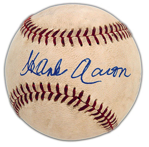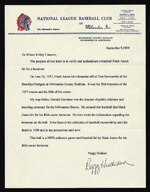 PLEASE NOTE: Robert Edward Auctions has determined that the authenticity of this lot is extremely questionable. We believe this item is a fraud and we have cancelled the sale of this lot. The Aaron signature is authentic, but we do not believe that this is a genuine Hank Aaron home run ball. We also believe that the accompanying letter from Donald Davidson's step-daughter is a fabrication. Many similar balls have been sold in many other auctions over the past several years. The widespread acceptance of these "Hank Aaron home run baseballs" in the marketplace caused us to let our guard down on this item when preparing this catalog. We apologize for any inconvenience.