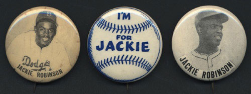 Trio of rare Jackie Robinson pins: 1) Classic "I'm For Jackie" pinback. This rare and unusual pinback was specifically designed to be worn as a show of support for Jackie Robinson by dedicated fans. In Near Mint condition. 2) This extremely rare circa 1947 Jackie Robinson PM10 stadium pinback featuring Jackie Robinson looking to the right is noteworthy not just for its great rarity, but because in the photograph used he is pictured wearing a Montreal Royals uniform. Robinson, of course, was called up to the Dodgers from Montreal, suggesting that this PM10 stadium pin may have been issued very early in 1947. This is one of the rarest of all Jackie Robinson stadium pins. In Near Mint condition. 3) This Jackie Robinson stadium pin featuring a head-and-shoulders portrait dates from Robinson's earliest years with the Dodgers. In this photograph Robinson is standing in front of the Dodgers dugout, and the background has been cropped out. This pin was issued with and without the dugout background. The pin has a few pinpoint foxing marks along the perimeter, of no consequence but which are mentioned for the sake of accuracy, and unusually heavy oxidation on the reverse, which of course does not affect the otherwise Excellent appearance of the front. This is a particularly scarce and desirable Jackie Robinson pin. Aside from Babe Ruth, perhaps no player has ever been the subject of more pins (and more interest from pin collectors) than Jackie Robinson. Diameter: each 1.75 inches. This lot presents three very significant Jackie Robinson celluloids worthy of any Jackie Robinson or advanced pinback collection. Reserve $400. Estimate $800/$1,200. SOLD FOR $1,624.00