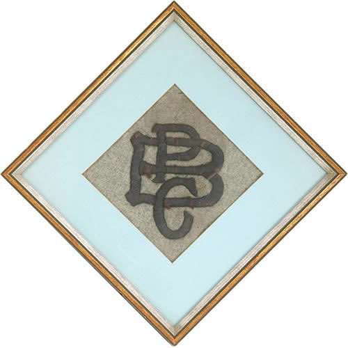 This embroidered Pittsburgh Pirates team logo ("PBC"), which is sewn upon a grey flannel uniform section, once adorned the left sleeve of a game jersey worn by Honus Wagner in 1908/09 (the logo only appeared on Pirates uniforms in 1908/09). It originates directly from Honus Wagner family and is accompanied by a signed letter of authenticity from Leslie Blair (Wagner's granddaughter). The significance of this small 4.5 x 4.5 inch square uniform section lies in the fact that no jersey or uniform dating from Wagner's playing days is known to have survived. Unfortunately, the existence of this section directly relates to that sad fact. According to the story told by the family, Wagner's 1909 jersey was the one example (dating from his playing days) saved by the Hall of Fame great. Approximately thirty years ago, his heirs, upon examining the tattered garment, noticed that it was in very poor condition with numerous tears throughout. At the time, having no reason to save it, they simply discarded it, but not before removing the sleeve logo, which they thought would make an appropriate keepsake. With that thought in mind they decided to have it matted and framed so that it could be properly displayed in their home. Today, the swatch still remains housed in that original frame; a rare remnant from one of baseball's greatest "lost treasures." This is the very sleeve patch and logo worn by Wagner that is seen on so many circa 1909 cards and photographs of Wagner. Instead of lamenting what might have been, collector's should instead "see the glass half full" and appreciate this piece for what it truly is: an extraordinary, unique, and significant partial game garment worn by Wagner during the height of his legendary career. The framed uniform section is accompanied by a non-vintage print featuring Wagner circa 1909, as well as an LOA from Wagner's granddaughter, Leslie (Wagner) Blair. Total dimensions 8.5 x 8.5 inches. Reserve $4,000. Estimate $8,000/$12,000.