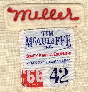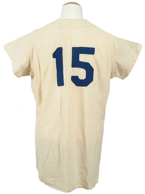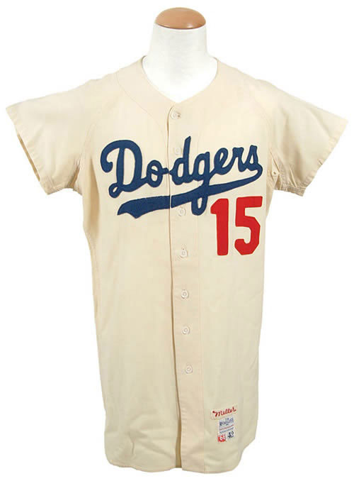 Los Angeles Dodgers home jersey worn by pitcher Bob Miller in 1966. The white flannel jersey is lettered "Dodgers" across the front and features the number "15" on the left breast and reverse. All letters and reverse numerals are appliquéd in blue felt. All front numerals are appliquéd in red felt. The name "Miller" is chain-stitched in red upon a strip tag on the left front tail. Directly below the name are a "Tim McAuliffe" label, a "66" year tag and a "42" size tag. The jersey is all original, with no alterations, and displays light wear. The Dodgers were National League champions in 1966, but were swept by the Orioles in the World Series, four games to none. Miller appeared in forty-six games with the Dodgers that season, all in relief, winning four games and posting a 2.72 ERA. It is not known whether or not the Dodgers wore their regular season uniforms in the 1966 World Series or a new set. If they did wear their regular season uniforms, the possibility exists that this particular garment was worn by Miller during the "fall classic." Regardless, it remains an exceptional mid-sixties Dodgers home flannel in all respects and has been graded a perfect A10 by MEARS. LOA from Dave Bushing & Troy Kinunen/MEARS. Reserve $300. Estimate $500/$1,000. SOLD FOR $1,044.00