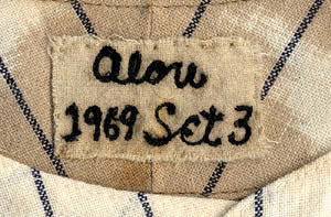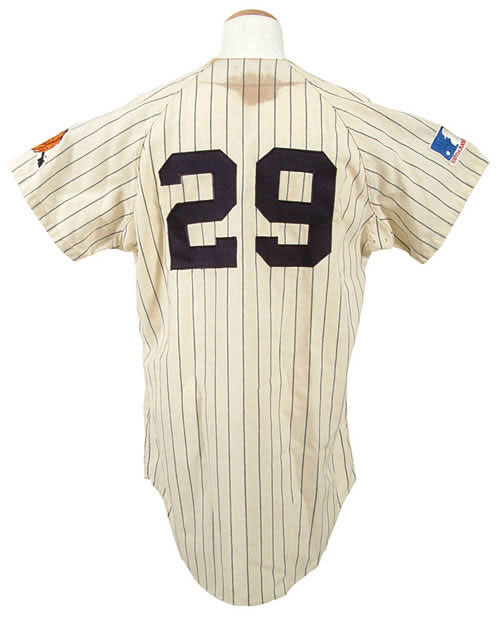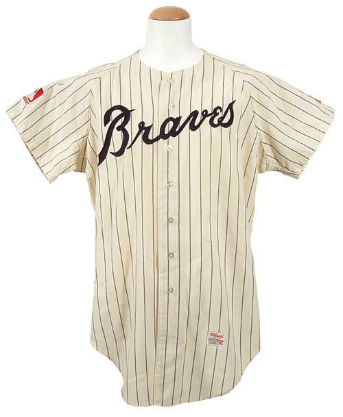Atlanta Braves home jersey worn by Felipe Alou in 1969. The white pinstripe flannel jersey is lettered "Braves" across the front and features the number "29" on the reverse. All letters and numerals are appliquéd in navy tackle twill. A Major League Baseball "100th Anniversary" patch (worn by all Major League clubs in 1969) appears on the right sleeve, while a Braves "Screaming Indian" patch adorns the opposite sleeve. The name "Alou," along with the year ("1969") and set number ("Set 3") are chain-stitched in black upon a strip tag in the collar. A "Wilson 42" label appears on the left front tail. The jersey is all original, with no alterations, and displays light wear throughout including a light stain (approximately 4 x 3.5 inches) in the collar. This particular jersey style was only employed by the Braves for the four-year period 1968 to 1971. Alou batted .282 in 1969, leading the Braves to the first ever National League West Division title (1969 marked the first season in which each League was divided into two divisions). Although the garment is not accompanied by any documentation to support its use during that inaugural NLCS, it stands to reason that the possibility certainly exists. Perhaps a future photo analysis will ultimately confirm or deny that possibility. Graded A9 by MEARS (base grade of 10, with one point deducted for the stain in the collar). LOA from Dave Bushing & Troy Kinunen/MEARS. Reserve $300. Estimate $500/$1,000. SOLD FOR $2,204.00