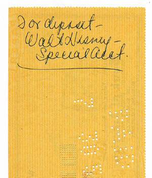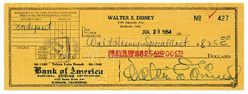Personal check, dated July 29, 1954, signed by famed animation pioneer Walt Disney. The check, made out to "Walt Disney-Special Acct." in the amount of $825 has been beautifully signed "Walter E. Disney" in blue fountain pen along the base. Disney's signature, scripted in his flourishing, artistic style measures over four inches in length and grades "9/10." Despite his celebrity status, authentic Walt Disney signatures remain quite scarce, as many of the examples found today are secretarial. For that reason, Walt Disney signed checks, due to their inherent authenticity, are especially prized by collectors. This is a particularly interesting check in terms of its date in that construction for Disneyland began on July 21, 1954, just seven days before this check was written. This is a magnificent example and one that would be ideal for inclusion in a framed display. The check (8.25 x 3 inches) bears Disney's name printed along the top and displays normal bank cancellation stamps and holes (none of which touch upon the signature). Excellent to Mint condition. LOA from Steve Grad & Zach Rullo/PSA DNA. Reserve $400. Estimate $800/$1,200. SOLD FOR $1,276.00