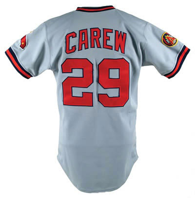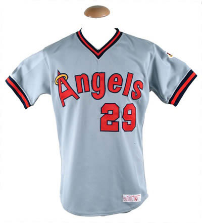 California Angels road jersey worn by seven-time American League batting champion Rod Carew during his final Major League season in 1985. Graded A10 by MEARS. The gray-knit jersey is lettered "Angels" across the front and features the number "29" on both the left breast and reverse. "Carew" is lettered on the reverse above the number. All letters and numerals are appliquéd in red on navy tackle twill. A California Angles team patch appears on the left sleeve, while an Angels "25th Anniversary" patch adorns the right sleeve. A "W. A. Goodman & Sons 42" label is located on the left front tail. The jersey is completely original, with no alterations, and displays moderate wear throughout. This jersey once resided in the famed Barry Halper Collection and is accompanied by an LOA from Barry Halper, dated 5/9/91, attesting to its provenance. A member of baseball"™s elite 3,000 Hit Club, Carew was one of the greatest hitters in baseball history. In 1977 he flirted with the magical .400 mark for much of the season before finishing with a league-leading and career-high average of .388. 1985 marked Carew"™s final season in baseball. Even at the age of forty he managed to appear in 127 games, finishing the season with a .280 average. He retired with a career .328 average and was elected to the Hall of Fame in 1991. Graded A10 by MEARS. This is one of only six Rod Carew jerseys in the MEARS census and one of only three grading A10. LOA from Dave Bushing & Troy Kinunen/MEARS.