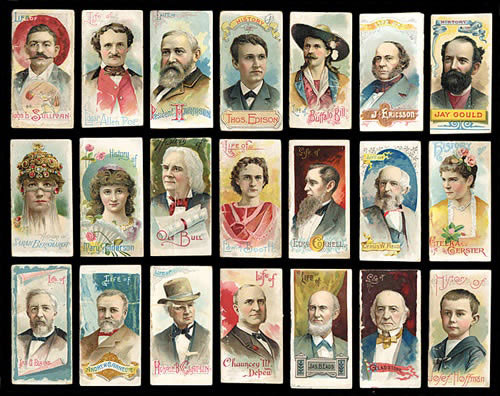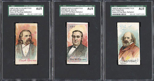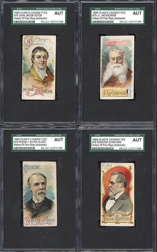 Near-complete set of 47 out of 50 1888 N79 Duke "Histories of Poor Boys and Other Famous People" booklets. Missing only three booklets for completion (P.T. Barnum, Mark Twain, and Jake Kilrain). This is a very attractive near-set of these extremely rare sixteen-page booklets with colorful covers, which were issued as premiums with Duke's Cigarettes, with conditions ranging from Gd to Vg-Ex (includes a few lesser). The following seven booklets have been encapsulated by SGC (designated "Auth"; SGC does not assign numerical grades to this set): Alger, Astor, Billings, Childs, Meissonier, Stanford, and Tennyson. Each booklet is the size of an insert card (2.75 x 1.5 inches) and features a portrait image of a historical figure (such as Buffalo Bill, Thomas Edison, Edgar Allan Poe, John L. Sullivan, etc.) on the front with a biography presented on the interior pages. These are very similar in design to the N78 Duke "Histories of Generals" booklets, and are, in fact, even rarer. The back cover of each features a beautiful colorful lithograph of a scene relating to the individual's field of interest. This is an extremely attractive near-set (missing just three booklets) with outstanding eye-appeal. Duke's "Histories of Poor Boys and Other Famous People" are rarely offered as a complete or near-complete set, and are highly prized by historical collectors, miniature book collectors, and nineteenth-century nonsport tobacco-card collectors. Total 47 booklets.