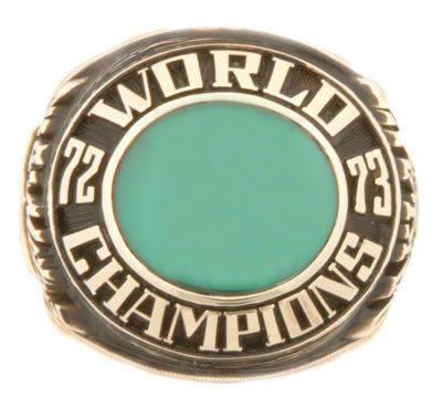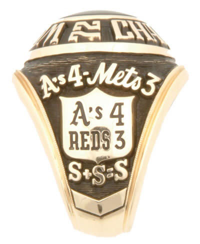 1973 Oakland Athletics World Series ring presented to Hall of Famer Billy Herman in recognition of his role as a very high-ranking team scout in the A's organization. 1973 marked Oakland's second consecutive World Championship, with the A's defeating the Mets in an exciting seven-game series. The design of this ring is especially notable for the fact that it does not contain any diamonds (normally a staple of any championship ring). The reason for that was the penurious nature of A's owner Charley Finley and the adversarial relationship he had with his players. In the book