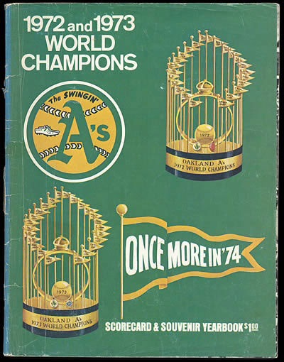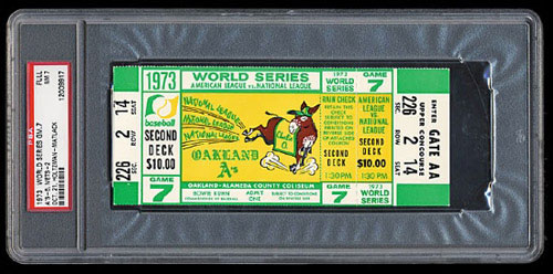 Despite their modest design, these rings are extremely rare today. Finley only awarded them to the players and coaches, as well as a small number of team officials. Possibly, some players may have even thown them away. Billy Herman, a Hall of Fame second baseman who was then the A's supervisor of scouting for the state of Florida, was one of the chosen few. The 14K gold ring, manufactured by Josten's, makes note of both the 1972 and 1973 World Championships and displays a large green stone on the front. Encircling the stone, in raised relief, is the notation "World Champions 72-73." The left shank features the A's team logo set within a baseball design. Above the logo is the name of the city, "Oakland," and below it the name of the recipient, "Herman," each in raised relief. The right shank features a shield design that displays the result of the 1972 World Series, "A's 4 - Reds 3." Above that, in raised relief is the result of the 1973 World Series, "A's 4 - Mets 3." Below the shield design are the letters "S + S = S." The interior of the ring is engraved "Josten's 14K." The ring (approximately size 7-1/2) remains in Near Mint condition and is housed in what appears to be its original green case. Accompanying the ring is a complete, full ticket to Game 7 of the 1973 World Series (Graded NM 7 by PSA) as well as a copy of Markusen's book and both a 1973 and 1974 A's yearbook, both of which list Billy Herman as a scout for the club. Also interesting is the fact that the interior cover of the 1974 yearbook features an ad for Josten's which pictures the 1973 World Series ring. Total: five items (ring, ticket, book and two programs).