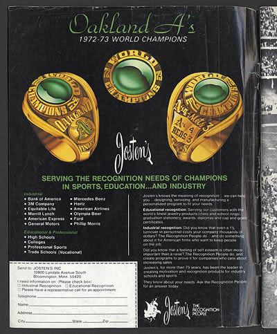 by Bruce Markusen (2002, St. Johann Press, Haworth, N. J.) the author describes how the presentation of the 1973 World Series rings ignited a controversy the following spring. Finley was apparently upset that the extravagant rings he awarded the players the previous year were, in his mind, not appreciated by them. According to Markusen, Finley told