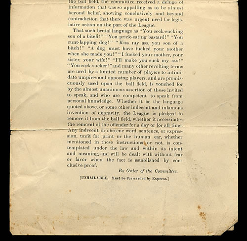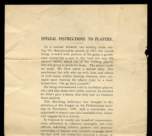 Items of historical significance can take many forms. We have always gone out of our way to stay away from items that we think are in poor taste or off-color. We also try our best to seize opportunities to document the history of the game and its relationship to American culture. Normally, there is never a conflict between those two policies; however, there are always exceptions, which brings us to the offered piece: an official League document, dating from 1898, titled "Special Instructions To Players." The document addresses the growing use of offensive language by players at the ballpark and stipulates the penalties for future infractions. It concludes with, "By Order of the Committee," below which is printed, in bold type, "UNMAILABLE. Must be forwarded by Express." It appears that this document was distributed in person to every player in the League, and may have even been posted in dugouts and clubhouses at the time. What sets it apart from all other official correspondence we have ever seen is the fact that it contains numerous examples of the obscene phrases and "brutal language" that it seeks to ban. The language featured in this document is so over the top that some might think it is simply a joke. It is not! We discovered the document, almost by accident, in a box containing a few odds and ends from the estate of baseball historian Al Kermisch. Collectors will recall that Robert Edward Auctions sold nearly all of Kermisch"™s personal collection, comprised of important and rare Baltimore baseball memorabilia dating from the late 1800s and early 1900s, in our April 2007 auction. In winter of 2007 a few additional interesting pieces were later found and brought to us for evaluation, among them this document. At first glance it appeared to be nothing, but as we began reading it, it quickly got our attention. The language kept getting "bluer" and "bluer" to the point where we weren't even sure if this was an item we could present at auction. We posted the story of its discovery on the REA blog. Never, in our thirty-plus years, have we received so many responses, comments, and opinions about a single piece. And not just by baseball memorabilia collectors. This piece elicited responses from hundreds of sports fans, historians, students of popular culture, fans of the HBO Deadwood series, professional linguists, and college professors, all of whom were drawn to the piece because of its ironic and early use of off-color language. Newspapers called. Salon.com did a story. For a couple of days it was hard to get any work done around here. Amazingly, a number of the eminent scholars who read this document believe that it contains the earliest appearance in print of a few, now commonly used, obscene words and phrases. (For more information regarding this piece, we recommend visiting the REA blog to read our three separate entries, two of which include links to additional articles and comments made by others relating to the document. The web addresses are: http://s210975194.onlinehome.us/blog/?p=41and http://s210975194.onlinehome.us/blog/?p=49 and http://s210975194.onlinehome.us/blog/?p=55 or just go the the REA blog on the REA website and click around: you'll find them).
