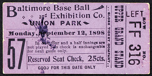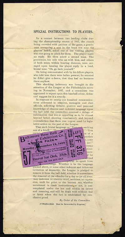 1898 Special Instructions to Players Regarding Obscene Language and 1898 Baltimore Orioles game ticket