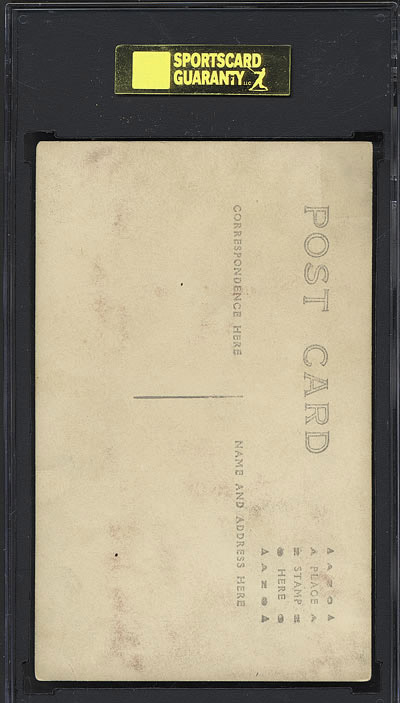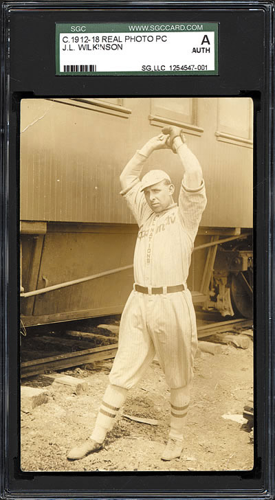 The extraordinarily significant and rare (possibly unique) real-photo postcard presented here captures recently elected Hall of Fame owner J. L. Wilkinson in uniform as a member of the All-Nations Team. This is a particularly remarkable card for Hall of Fame card collectors. To the best of our knowledge, this is the only card picturing Wilkinson alone (as well as being the only example of this real-photo postcard known to exist) and thus can be considered his one and only baseball card. Incredibly, this extremely significant card is a very recent discovery to the collecting world, unknown until 2007. (Note: Wilkinson does appear on a team postcard as owner of one of the first all-girls barnstorming teams, the 1909 Hopkins Brothers Lady Baseball Club from Des Moines, Iowa, which while not quite the same as this amazing card, at least is an alternative.) Wilkinson was one of the key figures in the early success of the Negro Leagues. In addition to being the founder and owner of the Kansas City Monarchs, one of the greatest teams in the history of the Negro Baseball Leagues, he was a pioneer in the use of lighting in baseball, and can also truly be given credit for giving Jackie Robinson his professional start in the game. Few executives have ever had a greater impact on the game in general, and the Negro Leagues in particular. Wilkinson is pictured on this card in his All-Nations Team uniform standing next to a railway car in a pitching pose, with arms overhead in mid windup. This team actually traveled by pullman train, so the fact that the train is pictured in the background is particularly noteworthy. In his earliest days in the game, Wilkinson was a promising pitcher until arm problems sidelined his career. Undaunted, he remained in the game as an owner and promoter by forming the All-Nations Team in 1912. The All-Nations was a multiracial team that was a precursor of the all-black Kansas City Monarchs. This postcard pictures him in his All Nations uniform and therefore dates sometime between the years 1912 and 1918. The manufacturing date of the postcard (1904-1918) further confirms the time period. Although Wilkinson was a white man, he is best remembered today as a pioneer figure in the Negro Leagues. After the All-Nations Team disbanded, Wilkinson took the best black ballplayers from the club and formed the Kansas City Monarchs, which he developed into one of the most successful franchises in Negro League history. The Monarchs were inaugural members of the original Negro National League in 1920 and then later the Negro American League, and won an unprecedented seventeen League pennants and two Colored World Series. In the early 1930s Wilkinson helped revolutionize the game by introducing night baseball and in 1945 he signed Jackie Robinson to his first professional contract. The Monarchs sent more black ballplayers to the white Major Leagues than any other Negro League team and nine of Wilkinson"™s Negro League players were eventually elected to the Hall of Fame, as well as Ernie Banks and Jackie Robinson. Wilkinson was elected to Hall of Fame in 2006, along with a sixteen other deserving Negro League players and executives. The postcard (3.5 x 5.5 inches) displays a few light creases in the upper right and left corners, and the lower right corner. A small piece of clear tape has been affixed to the reverse in support of the upper left corner creases. The postcard has never been mailed. In Very Good to Excellent condition. Reserve $1,000. Estimate (open). SOLD FOR $4,112.50