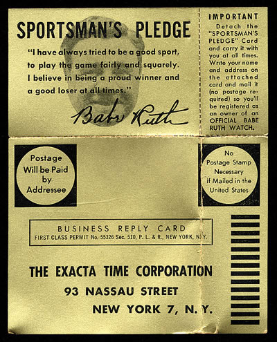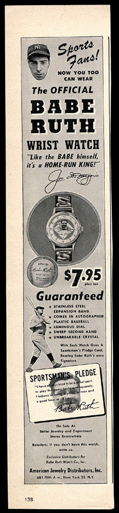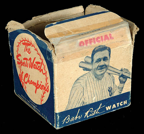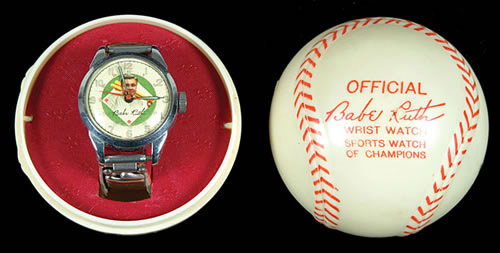 Babe Ruth wristwatch complete with original plastic ball case, retail display box, and registration card. Also included is a vintage magazine page advertisement. This is a classic Ruth collectible and one rarely found presented together with many of its original accessories. The colorful watch, manufactured by the Exacta Time Corporation, features Ruth's image on the facing along with his facsimile signature. Included with the watch is the original plastic ball case, the original retail display box (featuring a photo of Ruth on two sides), the original product registration card (also picturing Ruth), and a portion of a magazine page bearing an advertisement for the watch. The advertisement itself measures 3 x 13.75 inches and features not only an image of Ruth, but also Joe DiMaggio, who gives the watch his ringing endorsement, "Like the BABE himself, it's a HOME-RUN KING!" A photo of the watch is prominently displayed in the advertisement, as is the original price, "$7.95." The advertisement is ideal for display with the watch. The watch is in working order and is in Excellent to Mint condition. The plastic ball case is in Excellent to Mint condition as well. The box is in low grade (the cover is detached and missing a flap, plus the box has numerous tears, some with tape repair) but is still ideal for display with the watch. The perforated gold-colored registration card (4 x 5 inches) has a vertical crease and one of the three perforated segments is detached (all segments are present). In Very Good condition. Reserve $200. Estimate $400/$800. SOLD FOR $1,410.00