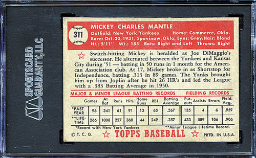 1952 Topps #311 Mickey Mantle, graded "Authentic" by SGC. This 1952 Topps #311 Mickey Mantle has the appearance of a pack-fresh gem. It is, however, an altered card that could easily be mistaken for a MINT card. It is an authentic 1952 Topps #311 Mickey Mantle which has had very sophisticated professional restoration. SGC has graded this card simply "Authentic" because under a black light they have detected that this card has undergone a very sophisticated process in which a foreign substance has been painstakingly and most professionally applied to the border areas of the card. Under a black light, the restoration is immediately apparent and glows. In normal light, only a trained eye can tell that the card has had any restoration. This card will never be assigned a numerical grade by SGC or any other major grading company. It will always be identified as restored by the most sophisticated, trained eyes. This is still a tremendous card, however, and represents a potentially extraordinary value for the collector who wants a beautiful 1952 Topps #311 Mickey Mantle at a far more affordable level than a graded example with a similar appearance. In fact, it is our understanding that this was precisely the intent of this restoration, and that it was not done with the intention of attempting to maliciously fool anyone. The card is crisp and clean, both front and back, with perfect centering, perfect registration, flawless bold colors, four strong, sharp corners, and perfect, bold printing on the reverse. In recent years we have seen an ever increasing appreciation for the exceptional value offered by cards such as this example. This is a unique opportunity to acquire a stunning authentic 1952 Topps Mantle with a MINT appearance at an extremely modest fraction of the SMR MINT 9 list price of $225,000. Reserve $2,000. Estimate (open). SOLD FOR $8,812.50