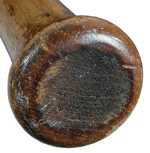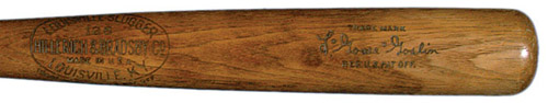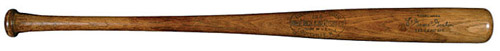 Goose Goslin H&B signature model (predating model numbers) bat dating from the 1921-1931 manufacturing period. The bat, which is composed of black hickory (a favorite of most sluggers during the 1920s), displays heavy use, including deep ball marks, surface marks, and a seven-inch crack in the handle. Ideally, most of the use is concentrated directly below the barrel stamping (the appropriate area for a left-handed hitter). Goslin signed his endorsement contract with H&B in 1924, thereby allowing the company to manufacture bats with his facsimile signature stamped on the barrel. That fact, along with a few slight variations in the center brand, allow the bat to be more narrowly dated to the 1925-1928 manufacturing period. This is an exceptional Goslin bat in all respects, and in fact is consistent with a documented order received by H&B from him in 1928, the year he won the American League batting title. The offered bat measures 35 inches in length and weighs 33.9 ounces. Factory records indicate that on 4/26/28 Goslin placed an order for 35-inch bats weighing 34 through 36 ounces. Although hickory bats are not specifically mentioned in his records between the years 1925 and 1928, later orders confirm his use of hickory bats. Goslin captured his one and only batting title in 1928, finishing the year with a career-high .379 average. Winning a batting title is never easy, but few players had to endure the drama Goslin went through on the final day of the season. Heading into the final game, Goslin was tied for the League lead with the Tigers' Heinie Manush. As fate would have it, Goslin's Senators were playing the Tigers that day. Obviously, Goslin had to play, otherwise Manush, with a good day, could overtake him. Goslin slightly outperformed Manush over the course of the game and held a one-point lead heading into his final at bat. Naturally, he wanted to come out of the game at that point to preserve his lead but his teammates goaded him into taking his regular turn at bat. At that point Goslin got into an argument with the umpire and tried to have himself ejected, to no avail. Eventually, it was all for naught as he eked out an infield hit to win the title. Goslin was one of the most prolific hitters of his era and even though he wasn't considered a slugger, he drove in over 100 runs on twelve separate occasions. He retired in 1938 with 248 home runs, 1,609 RBI (27th on the all-time list), and a .316 lifetime average. He was elected to the Hall of Fame in 1968. Graded A7.5 by MEARS (5 point base grade plus 3 points for use, but minus a half point for the handle crack). This one of only three Goose Goslin pro-model bats listed in the MEARS census, with no others graded at this level and only one graded higher. This bat has been consigned to this auction directly from the personal collection/inventory of world-renowned bat authenticator David Bushing. LOA from Dave Bushing & Troy Kinunen/MEARS. Reserve $1,000. Estimate $2,000/$3,000. SOLD FOR $4,406.25
