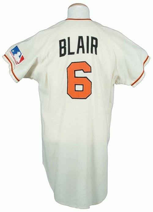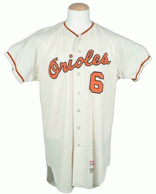 Baltimore Orioles home jersey worn by perennial Gold-Glove centerfielder Paul Blair during the club"™s pennant-winning season of 1969. Graded A9.5 by MEARS. The white flannel jersey is lettered "Orioles" across the front and features the number "6" on both the left breast and reverse. "Blair" is lettered on the reverse above the number. All front letters and numerals are appliquéd in orange tackle twill on black felt. All reverse letters are appliquéd in black felt. A Major League Baseball "100th Anniversary" patch adorns the left sleeve. A "Wilson 40" label is situated on the left front tail. Both the year and set number ("1969 Set 2") are chain-stitched in black upon a white strip tag located directly below the manufacturer's label. The "100th Anniversary" patch on the left sleeve has been replaced (the replacement is an authentic example); otherwise the jersey is all original with no other alterations. Moderate-to-heavy wear is displayed throughout, especially to the felt lettering and numbers. Paul Blair was one of the greatest defensive centerfielders of his era and the recipient of eight Gold Glove Awards between the years 1967 and 1975. Blair enjoyed one of his finest all-around seasons in 1969, batting .285 with career highs in both home runs (26) and RBI (76) in leading the Orioles to their first of three consecutive American League Championships. Graded A9.5 by MEARS (base grade of 10, with a half point deducted for the replaced patch). This is the only Paul Blair jersey, and one of only two 1969 Orioles jerseys listed in the MEARS census (the other 1969 example was worn by Frank Robinson and is graded A10). 1960s Orioles home flannels are highly desirable and this one is exceptional on all accounts: grade, player, and year. LOA from Troy Kinunen/MEARS. Reserve $300. Estimate $500/$1,000+. SOLD FOR $4,113