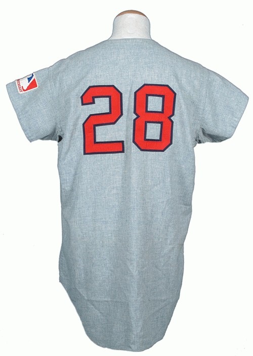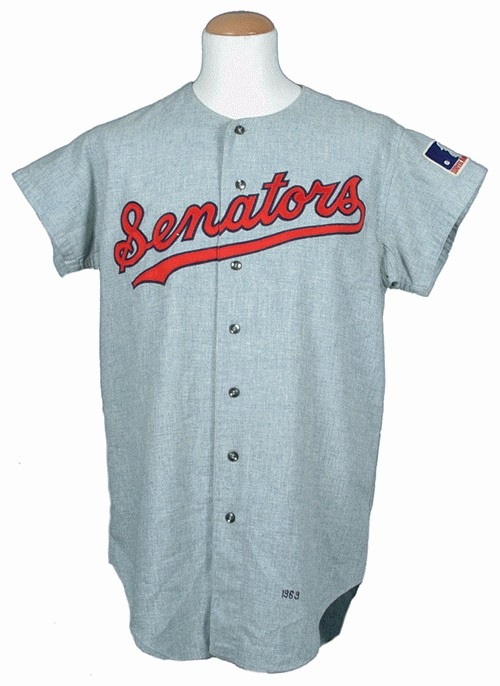 Washington Senators road jersey worn by journeyman pitcher Dennis Higgins in 1969. Graded A10 by MEARS. The gray flannel road jersey is lettered "Senators" across the front and features the number "28" on the reverse. All letters and numerals are appliquéd in red on navy tackle twill. The official Major League Baseball "100th Anniversary" patch is located on the left sleeve. A "Wilson 42" label appears in the collar, while the year, "1969," is chain-stitched in black on the left front tail. Original and unaltered, the jersey displays light moderate wear. The Washington Senators shocked the baseball world in 1969 when they finished 10 games over .500 under rookie manager Ted Williams. A large part of Washington"™s success that year was Williams"™ use of the bullpen, which featured a closer from either side: left-hander Darold Knowles and right-hander Dennis Higgins. Higgins, the bullpen ace in 1969 with 10 wins and 16 saves, began his Major League career in 1966 with the White Sox and joined Washington in 1968. He retired just three years later with a career record of 22-23, 46 saves, and a 3.42 lifetime ERA. Graded A10 by MEARS. This is one of only ten expansion-era Washington Senators jerseys (1961-1971) listed in the MEARS census, with only four others graded at this level. LOA from Troy Kinunen/MEARS. Reserve $500. Estimate $1,000+. SOLD FOR $1,293