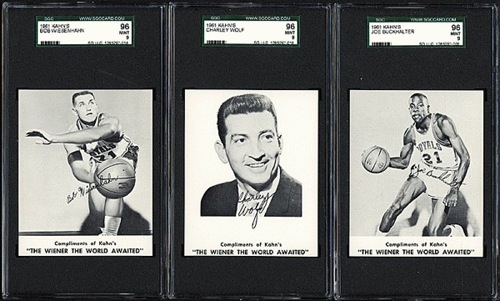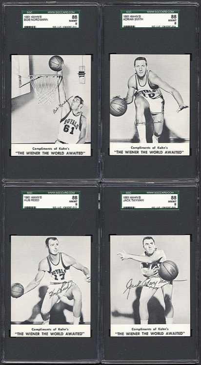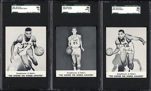 Unbelievably high-grade complete thirteen-card set of 1961 Kahn"™s Wieners basketball cards, highlighted by Hall of Famers Jerry West and Oscar Robertson. When this set arrived in our offices (ungraded), sent in by a very longtime collector, we were amazed by the condition. This is by far the finest set of 1961-62 Kahn's Weiners Basketball we have ever seen. REA submitted the entire set for grading, as we felt the extraordinary condition of the set warranted this investment in time and expense. The very scarce 1961-1962 Kahn's Weiners basketball set features twelve members of the Cincinnati Royals (including for the first time the Royals' coach) and also Los Angeles Lakers star Jerry West. One card was issued with each package of Kahn's meats. Because of the product with which they were packaged, heavy grease stains and creases are common with this issue, making it all the more difficult to assemble a high-grade set. All the cards are bright, crisp, and incredibly fresh across the board. Each card has been graded and encapsulated by SGC. The SGC grades are as follows: Four MINT 96: Buckhalter, Embry, Wiesenhahn, and Wolf. One NM/MT+ 92: Bockhorn. Five NM/MT 88: Nordmann, Reed, Smith, Twyman, and West. Two NM+ 86: Boozer and Zeller. One NM 84: Robertson. This is a remarkably crisp high-grade set of this popular and attractive issue. The condition of this set (which has an average SGC grade exceeding NM/MT condition) is superior to even that of the number-one all-time finest set on the PSA Set Registry (which has an average grade of 7.65). Kahn's Wieners cards are far rarer than most 1960s basketball cards, and are one of the few food issues of the era. Total 13 cards. Reserve $1,000. Estimate (open). SOLD FOR $11,163