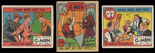 In the 1930s, G-Men had their hands full fighting crime. The many high-profile cases of the era were plastered across the front pages all across America, capturing the imaginations of youngsters and adults alike, and, of course, inspiring several trading-card sets. Offered in this lot are two 1936 American G-Men sets (R13-1 and R13-2), the first and second series. No manufacturer is listed on the cards, but they are very likely produced by M. Pressner & Company (who also produced the similar "Government Agents vs. Public Enemies" series). Each set is comprised of 48 cards, for a total of 96 cards. Series 1 (#101-148): 23 cards range from Vg to Vg-Ex, 25 cards are mostly Gd (with a few slightly lesser). Series 2 (#701-748): 16 cards range from Vg to Vg-Ex, 32 cards are mostly Gd (with a few slightly lesser). These two complete nonsport sets dating from the late 1930s are often referred to as "strip cards" because these sets were originally issued in uncut perforated strips. Though the 1930s were dominated by traditional bubble-gum cards, quite a few card sets were issued in this format. Most are very similar in design, and were numbered with card numbers beginning with high numbers (such as 101, 201, etc.) as opposed to beginning with number "1." These cards are printed on a relatively inexpensive, porous stock, and are characterized by a somewhat primitive style of illustration. These two rarely offered and fascinating complete sets each represent this particular style of card production unique to the era. Total 2 sets (each 48 cards for a total of 96). Reserve $400. Estimate (open). SOLD FOR $588