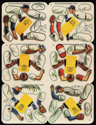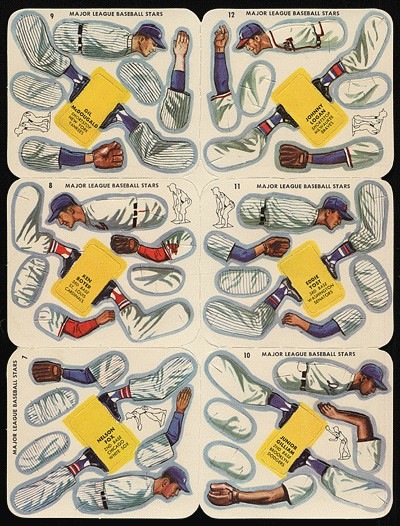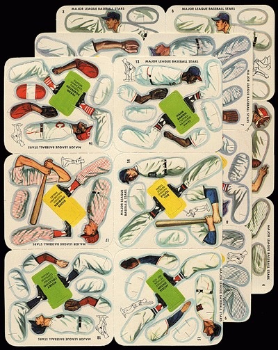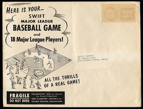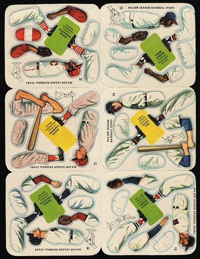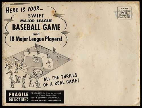 Complete set of all eighteen cards issued in 1957 by Swift Meats in virtually perfect Nr/Mt-Mt condition. Available direct from Swift Meats only by mail, the set is presented in three uncut perforated sheets of six cards each as originally issued. Cards from this unique and very colorful set were meant to be punched out and assembled to create 3-D figures of the players. Keys: Hank Aaron, Nellie Fox, Frank Robinson, Richie Ashburn, and Rocky Colavito (all perfect Nr/Mt-Mt condition). Also included is the paper game board which was produced to accompany the set and which allows for a game to be played with the figures. The board is in virtually Mint condition. Also accompanying the set is the original Swift Meats envelope in which the set was originally packaged. The envelope has advertising for "Swift Major League Baseball Game." The envelope is in Very Good to Excellent condition with original mailing label and metered postage attached. The cards are bright and crisp, and have obviously remained untouched and perfectly protected since 1957. This is a virtually flawless complete set of this unique 1950s regional issue in its original and ideal form, looking exactly as it did when it arrived in the mail in 1957. Extremely attractive and colorful. Reserve $500. Estimate $1,000/$1,500. SOLD FOR $3,819