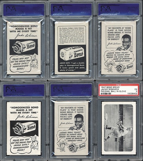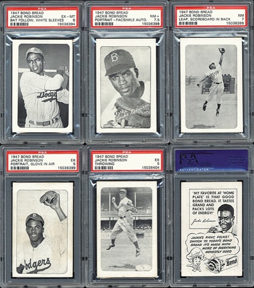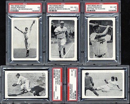 Exceptional high-grade near-complete set featuring eleven of the thirteen cards from the 1947 Bond Bread series, one of the most historically significant baseball-card sets ever issued. Missing only two cards for completion: #1 (awaiting pitch) and #9 (running to catch ball). This set was issued in 1947 to commemorate Robinson's historic shattering of the color barrier. Each card in the set features Jackie Robinson. The cards were regionally distributed only in the New York area, and were primarily available in black neighborhoods. One card was packaged with each loaf of Bond Bread. This collection of eleven cards (of the thirteen cards which comprise the set) represents a very substantial foundation upon which to build a complete high-grade set. Only a few complete sets of this extremely rare issue have ever been assembled. All eleven cards have been encapsulated and graded by PSA: #2 batting, white sleeves (EX-MT 6), 3 batting, no sleeves (EX-MT 6), 4 leaping, scoreboard (NM 7), 5 leaping, no scoreboard (EX 5), 6 portrait, facsimile autograph (NM+ 7.5), 7 portrait, glove in air (EX 5), 8 running down baseline (VG-EX+ 4.5), 10 sliding (EX-MT 6), 11 stretching for throw, ball visible (EX 5), 12 stretching for throw, no ball visible (NM 7), 13 throwing (EX 5). Card numbers are from the Standard Catalog of Baseball Cards. From the Charlie Conlon Collection. Total 11 cards. Reserve $2,500. Estimate $5,000++. SOLD FOR $23,500
