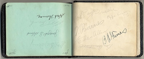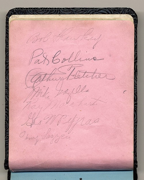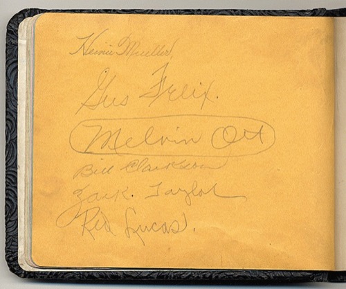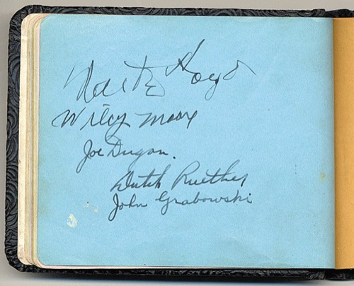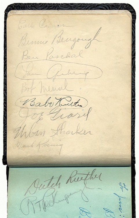 This extraordinary autograph album, which is new to the organized collecting world, includes the signatures of twenty-three members of the 1927 New York Yankees, among them Babe Ruth, Lou Gehrig, and Joe Giard, plus those of thirty-one other prominent players from the era, such as Ott, Terry, and Bresnahan. A total of sixteen Hall of Fame signatures (fourteen different) appear in the book. When our consignor first contacted us regarding this album, we were only told that it had the signatures of Ruth, Gehrig and a few other Hall of Famers. After receiving it, we soon realized how much more significant the book was than described, as included are the signatures of nearly every member of the entire 1927 New York Yankees team, considered by many to be the greatest ball club ever assembled. According to our consignor, her father, James Fay, obtained all of the signatures in this book personally during the late 1920s by waiting for the players outside the stadium after games. Fay lived in the Bronx at the time (where the family still resides) and it"™s obvious by the inclusion of the many National League signatures here that in addition to Yankee Stadium he also frequently visited the nearby Polo Grounds as well. Fay originally purchased the sixty-one page leather-bound book (6 x 5 inches) for use as a high school autograph book (his name, the name of the school, and graduation date, "James Fay, Our Lady of Good Counsel "“ June 17, 1926," appear on the first page). Nearly all of the pages contain inscriptions from classmates and teachers; however, some pages (usually on the reverse of an inscribed page) also feature signatures of Major League players, most notably members of the 1927 New York Yankees. The complete list of baseball signatures in the book is as follows (in pencil unless noted as scripted in black fountain pen): 1927 New York Yankees (twenty-three signatures, not all on the same page) : Ruth (black fountain pen, signature circled in pencil, grading "9"), Gehrig (signature circled in pencil, "8/9"), Giard (a pencil circle around the Ruth signature touches upon the Giard signature, otherwise "8/9"), Shocker , Koenig, Meusel, Paschal, Bengough, Comb s, Ruether (twice, one in black fountain pen), Shawkey, Collins, Fletcher (coach), Gazella, Morehart, Pipgrass, Lazzeri , Wera (black fountain pen), Durst (black fountain pen), Hoyt (black fountain pen), Moore (black fountain pen), Dugan (black fountain pen), and Grabowski (black fountain pen). The book also contains the signature (black fountain pen) of team owner Jacob Ruppert. This is an amazing compilation of signatures that includes twenty-two of the twenty-five roster players from 1927; missing only manager Miller Huggins, Herb Pennock, Myles Thomas, and Walter Beall. While the signatures of Ruth and Gehrig are the most prominent, it is that of Giard that is most highly sought after by collectors. Joe Giard"™s Major League pitching career lasted three seasons and he finished his career with a lifetime record of 13-15 and a 5.96 ERA. Despite those less than impressive accomplishments, his signature is highly prized today due to the fact that Girard is the most elusive of all 1927 Yankees signatures and the key rarity in completing a set of 1927 New York Yankees signatures. Giard"™s final season was with the legendary 1927 New York Yankees and he passed away in 1956 at the age of fifty-eight. The signature of Urban Shocker is also rare, as he passed away in 1928. The acquisition of signature examples of all twenty-five 1927 New York Yankees roster players, plus manager Miller Huggins, is a monumental feat that few collectors have achieved. As a point of reference, a collection of nineteen different 1927 New York Yankees signatures, which DID NOT included Ruth, Gehrig, and Giard, sold for $14,100 in Robert Edward Auctions' April 2007 sale (Lot 647). Value is very subjective, and every group of autographs is very different, but clearly the 1927 Yankees signatures in this album make it a very significant find . Additional Signatures: Roger Peckinpaugh, Leslie Mann, Bill Clarkson (twice), Al DeVommer, Dutch Henry, Larry Benton, George Harper, Freddie Fitzsimmons , Dazzy Vance (signature circled in pencil), Herb Thomas (twice), Heinie Mueller (twice, once in black fountain pen), Gus Felix , Mel Ott (signature circled in pencil), Zack Taylor, Red Lucas, Ben Cantwell (twice, once in black fountain pen), Ethan Allen , Burleigh Grimes (twice, both in black fountain pen), Virgil Barnes , Eppa Rixe y, Rube Bressler , Bill Terry (twice, once in black fountain pen) , Ed Roush, Ray Schalk (in black fountain pen), Bert Cole (in black fountain pen), Bibb Falk (in black fountain pen), Alex Metzler (in black fountain pen), Bud Clancy (in black fountain pen) , Roger Bresnahan (in black fountain pen), Jack Cummings, and Freddie Lindstrom . There are two other signatures in the book that appear to be those of Major League players, but they are illegible. Based upon the names present here, it is almost certain that all of the signatures were obtained in 1927. This is a remarkable collection of vintage signatures, many of which are rare, highlighted by the near-complete roster of the 1927 New York Yankees. The signatures range from "5" to "10," averaging "8." The pages display minor handling wear and the album is in Excellent condition overall. LOA from James Spence/JSA Reserve $2,000. Estimate (open). SOLD FOR $7,638