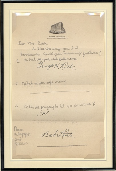 Two flawless Babe Ruth signatures by the fabled "Sultan of Swat," appear here on this undated fan letter sent to Ruth sometime during the 1920s. The one-page letter, scripted in pencil on Hotel Charles (Springfield, Massachusetts) stationery, was written to Ruth by an unidentified fan who asks him to answer three questions. The letter reads as follows: "Dear Mr. Ruth - I like the way you hit home runs. Could you answer my questions? What is your real full name." Here Ruth replies "George H. Ruth" in black fountain pen (grading "10"). The next question is "What is your wife name" Ruth has left this answer blank. The final question is notable both for its content and helping to date the letter: "When are you going to hit 60 Home Runs?" While the year "1927" is written in the space provided, it is the opinion of JSA that this answer was also originally left blank by Ruth, and filled in by the recipient after the fact (as opposed to in Ruth's hand). Along the base the fan has one last request of Ruth: "Please autograph and return." Ruth has complied once again by scripting his name, "Babe Ruth," in black fountain pen (grading "10.") Ruth, of course, did indeed hit a record 60 home runs in 1927. Prior to 1927, Ruth was already the current record holder for home runs with 59, which is no doubt why the writer chose the number "60" in his or her query. Although the letter is undated, based on the question relating to 60 home runs, it is a virtual certainty that this letter was therefore written just prior to or during the 1927 season. The fact that Ruth left question two blank is consistent with JSA's opinion that the 60 home runs question was also originally left blank by Ruth. The unanswered question number two asking his wife's name, however, may have an additional great significance all by itself. Ruth married Helen Woodford in 1914, but by the early 1920s the couple had become estranged and were basically separated, with Helen living in Massachusetts with their adopted daughter, and Ruth living alone in New York. (Ruth's strict Catholic upbringing forbade him from seeking a divorce.) Ruth was actually dating the woman who would become his second wife, Claire Hodgson, during the mid 1920s. (Helen died in 1929 and Ruth married Claire shortly afterwards.) Therefore, Ruth probably felt it was not appropriate to list Helen as his wife at the time. This is an extraordinary Ruth signed piece, both for the two high-grade signatures variations, and for the interesting form in which they are presented. The letter (6 x 9 inches) displays three horizontal mailing folds and is otherwise in Near Mint condition. Mounted and framed to total dimensions of 11 x 14 inches. LOA from James Spence/JSA. Reserve $2,000. Estimate (open). SOLD FOR $7,638