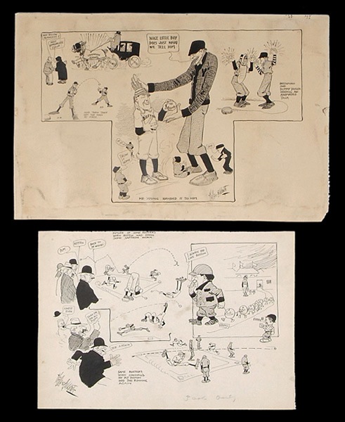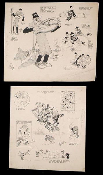 Addendum: This lot contains twenty original cartoon artworks, plus five cut panels, for a total of twenty-five pieces. The catalog description mistakenly listed a total of twenty-four pieces in this lot. Also, one of the panel cartoons displays a horizontal tear along the top border. Collection of twenty original cartoon artworks by artist Wallace Goldsmith dating from circa 1905. All of these artworks originate from the personal collection of Fred Tenney, who was both a player and manager with the Boston Braves between the years 1894 and 1907, and again in 1911. They have been consigned to this auction directly by the Tenney family. (The family has also consigned to this auction Tenney's 1908 New York Giants jersey, his glove, a trophy ball, his personal equipment, and a smaller group of Goldsmith cartoon artworks that all depict Tenney.) Wallace Goldsmith (1873-1945) was an extremely prominent sports cartoonist for the Boston Globe during the early 1900s and this collection of cartoons represents an outstanding representative sampling of his work. The finely rendered illustrations, done in ink on paper, feature novel caricatures of the players in a number of humorous vignettes relating to the most recent game. All have been signed by Goldsmith in black ink. Large-format cartoons such as these were very popular during the period and provided fans with a look at the lighter side of the game. Each of the artworks offered here was published at the time. Both the Boston Braves and Boston Red Sox are lampooned in these works, which feature many notable players from the era, including Cy Young, Roger Bresnahan, Dummy Taylor, Christy Mathewson, Hooks Wiltse, Joe Kelley, August Herrman, Vic Willis, Frank Chance, Johnny Evers, Jake Beckley, and Hugh Duffy. Ideal for display, these are very rarely seen museum-caliber original artworks. The artworks, which range in size from 14 x 10 to 21.5 x 14 inches, display wear commensurate with their age and fragile nature, including edge tears, corner chips, and light soiling. Many display editorial notations on the front as well. Most of the condition flaws are relegated to the border areas and could easily be matted out if so desired, leaving the central image areas with an overall Excellent appearance. Also included here are five smaller Goldsmith cartoon artworks (8 x 5 inches on average) that appear to be panels cut from larger strips. A letter of provenance from Tenney's great-granddaughter accompanies. Total: 20 cartoon artworks plus 5 cut cartoon panels. Reserve $1,000. Estimate (open).