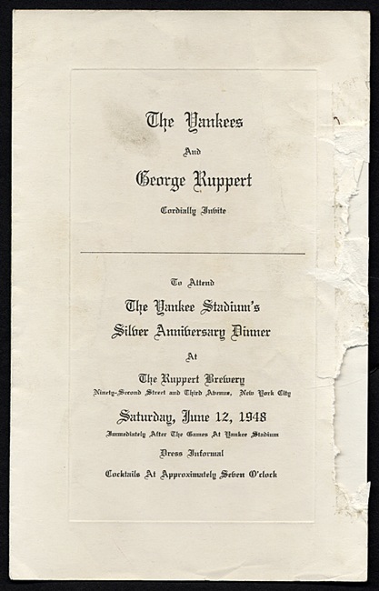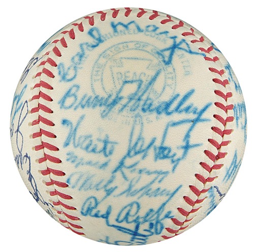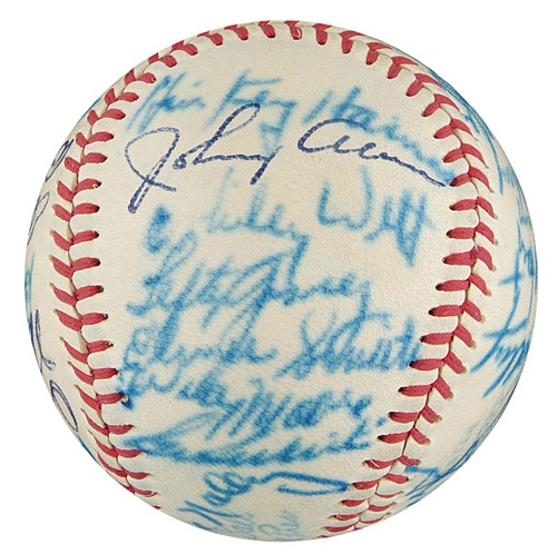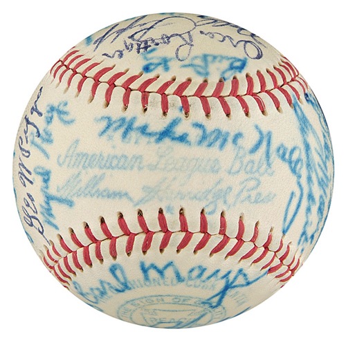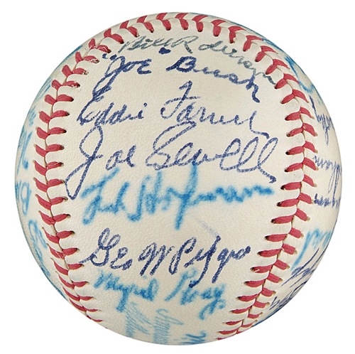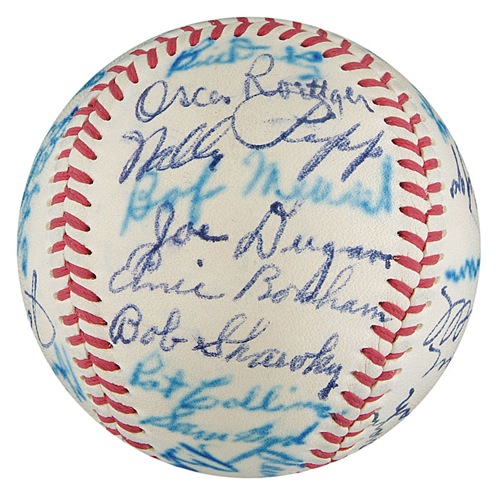 June 13, 1948 was a special day in New York Yankees history, for it was on that date the club celebrated the 25th anniversary of Yankee Stadium. Among the highlights that day was a reunion of the 1923 Yankees team and, most important, a special ceremony in which the Yankees formally retired Babe Ruth's uniform number. That historic event marked Ruth's final appearance both in a Yankees uniform and at Yankee Stadium, as he passed away just two months later on August 16th. (Nat Fein's famous Pulitizer Prize winning photo, titled "The Babe Bows Out," was taken on this day.) This extraordinary signed baseball dates to that memorable day and features the signatures of sixteen members of the 1923 Yankees, including Babe Ruth, plus fifteen additional signatures of former New York Yankees who attended the event. The significance of this ball cannot be overstated. This is undoubtedly one of the last balls Babe Ruth ever signed. Ruth was extremely ill at the time and it is a well-known fact that he was signing very few items during the final months of his life (Ruth had a full-time secretary to handle all of his fan correspondence, and both she and his wife signed for him quite regularly in 1948). The fact that it dates both from the day in which his uniform number was retired and his last appearance in Yankee Stadium makes it one of the most remarkable Ruth balls ever to surface. We have been told (no formal documentation accompanies the ball) that this official American League (Harridge) ball originates from the estate of former New York Yankees player Jake Powell. Furthermore, the oral history accompanying the ball has it that a number of the signatures were obtained on the ball at a banquet dinner held by the Yankees the night before, and the remainder, including Ruth's, were added the next day at the Stadium. (Supposedly, the sweet spot was left untouched the night before so that Ruth could have the honor of signing the ball there the next day.) That sounds extremely plausible, especially given the fact that the ball is signed in two distinct shades of blue ink. The sixteen members of the 1923 Yankees who have signed this ball are Babe Ruth (sweet spot, grading a strong "8" slight bleeding), Waite Hoyt, Bob Meusel, Wally Pipp, Joe Dugan, Whitey Witt, Wally Schang, Joe Bush, Bob Shawkey, Carl Mays, Fred Hofmann, Elmer Smith, Mike McNally, Hinkey Haines, George Pipgras, and Oscar Roettger. The remaining fifteen signatures on the ball, all by former Yankees, are those of Lefty Gomez, Joe Sewell, Bill Dickey, Bump Hadley, Mark Koenig, Red Rolfe, Hank Borowy (sweet spot), Sam Byrd, Pat Collins, Ernie Bonham, Eddie Farrell, Myril Hoag, George Selkirk, Wilcy Moore, and Johnny Allen. There is one other signature on the ball that is partially illegible (does not appear to be that of a former Yankees player). The signatures are scripted in two different shades of ink. The eleven "dark-blue" ink signatures grade "8/9" on average, while twenty-one "light-blue" signatures, one of which is Ruth, all display some degree of light bleeding and range from "6" to "8." According to our research, the only member of the 1923 club who was present that day and did not sign this ball was Sam Jones. The other Yankees on this ball were all in attendance to both celebrate the event and also to take part in a two-inning exhibition game against the 1923 club. The ball was obviously well cared for all these years as it remains in phenomenal Near Mint condition. This is the only 1923 New York Yankees team-signed reunion ball from that landmark day that we have ever seen, let alone handled, and as such it stands as one of the most noteworthy and historically significant of all Ruth-signed balls in existence. Together with an invitation to the New York Yankees reunion dinner held the night prior, on April 12, 1948 (Gd-Vg). LOA from James Spence/JSA. Reserve $2,500. Reserve $5,000++.