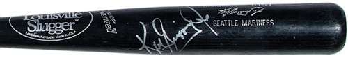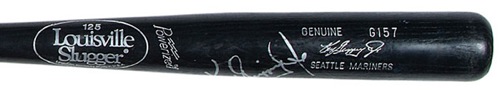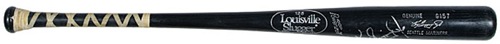 Ken Griffey Jr. Louisville Slugger signature-model "G157" bat dating to the 1991 to 1997 manufacturing period. Graded A10 by MEARS. This is not just the highest-graded Ken Griffey Jr. bat listed in the MEARS census, but also the only Ken Griffey Jr. bat to ever merit a perfect grade of A10. Ideally, the factory records allow us to definitively date this bat to 1992, which was Griffey's fourth season in the Majors. The Louisville Slugger shipping records indicate that Griffey received just one shipment of model "G157" bats during his career, with that order of six bats having been sent on September 17, 1992. The black, cupped-end bat displays heavy use along its entire length, including deeply embedded ball marks and stitch impressions (eight ball marks exhibit blue-ink transfers from American League balls), rack marks, cleat marks, a light application of pine tar on the handle, and deadwood. A wrap of white tape, done in Griffey's trademark "criss-cross" pattern, extends 9.5 inches up the handle. Griffey has signed the bat in silver paint pen (grading "9") on the "sweet spot" of the barrel. Griffey batted .308 with 27 home runs and 103 RBI in 1992, with both his home run and RBI totals representing career highs at the time. Already considered one of the best all-around players in the game in 1992, Griffey quickly progressed to become one of baseball's top sluggers. Beginning in 1993, Griffey totaled forty or more home runs in seven of the next eight seasons, including a career-high 56 in both 1997 and 1998. Today, Griffey ranks fifth on the all-time home run list with 630. Length: 33.75 inches. Weight: 31.6 ounces. Graded A10 by MEARS (5 point base grade, plus 3 points for use, and 2 points for documented player characteristics). This is one of sixteen Ken Griffey Jr. bats listed in the MEARS census, with no others graded at this level. For those used by a modern-day player, Griffey bats are much scarcer than one would think, with this example ranking as one of the finest known. LOAs from Troy Kinunen/MEARS and James Spence/JSA. Reserve $400. Estimate $800/$1,200.