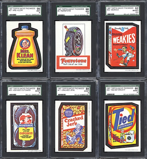 Ultra high-grade near-complete master set of 1967 Wacky Packages includes 51 different of the 60 die-cuts (including all number variations) in the set, entirely graded and encapsulated by SGC (except two PSA). This is by far the best and highest-grade original 1967 Wacky Packages collection we have ever offered! There were originally forty-four titles in the Wacky Pack set, each numbered on the back. Due to cease and desist letters sent to Topps, several titles were pulled and replaced on the printing sheets by duplicates of other titles, thus creating rarities and numbering variations. This near-complete master-set is missing only seven rare variations and the two early-withdrawn extreme rarities for completion: the set does not include the extremely rare Cracked Animals (offered as a separate lot in this auction) and Ratz Crackers die-cuts (both of which were withdrawn very early from production). The missing rare number variations are #3b Jolly Mean Giant, 21b Jolly Mean Giant (offered as a separate lot in this auction), 32c Chock Full o' Nuts and Bolts, 34b Paul Maul, 41b Spray Nit, 43b Maddie Boy, and 43c Breadcrust Corned Beef Hash. The die-cut series was the first series of Wacky Packages released in 1967. The success of this set, designed with perforations on card stock with gummed glue on the reverse, predated the sticker format that is most closely associated with Wacky Packs, but these were the first. This is the set that kicked off the Wacky Pack craze! When Wacky Packs were issued in the late 1960s, kids went wild. Whether it was the times, as youngsters became more enlightened as to the manipulations of Madison Avenue, or the amusing irreverence of the artwork, the set struck a chord with the youth of America, which continues to this day. In the world of Wacky Packs, this first set is both rare and historically significant. Forty-seven cards range in grade from Nr/Mt to Mint, and five cards lesser. SGC Condition Report: One GEM 98: #2a Fearstone Tires. Five MINT 96: #4 Camals Cigarettes, 8 Lavirus, 27 Mrs. Klean, 30 Horrid Deodorant, and 34a Duzn't Detergent. Five NM/MT+ 92: #7 Spray Nit, 20 Gadzooka Gum, 29 Cover Ghoul, 32b Weakies, and 37b Breadcrust Corned Beef Hash. Twenty-one NM/MT 88: #1 Boredom's Instant Coffee, 3a Vicejoy Cigarettes, 5b Chock Full o' Nuts and Bolts (PSA NM-MT 8), 10 Dopey Whip, 11 Cracked Jerk, 12 Crust Toothpaste, 14 Alcohol Seltzer, 16 Pure Hex, 17 Weakies, 18a Schmutz Beer, 22 Liptorn Soup, 23a Muller Beer, 25 Chock Full o' Nuts and Bolts, 26 Tied Detergent, 31 Jail-O, 35 Fink, 36 Maddie Boy, 38 Cracked Jerk, 39 Hostage Cupcakes, 40 Mutt's Apple Juice, and 41a 6-Up. Three NM+ 86: #9 Paul Maul, 18b Quacker Oats (PSA NM+ 7.5), and 42 Skimpy. Twelve NM 84: #6a Slum-Maid Raisins, 13 Kook-Aid, 15a De-Mented Rotten Tomatoes, 15b Skimpy, 19 Minute Lice, 23b 6-UP, 24 Band-Ache Strips, 28 Breadcrust Corned Beef Hash, 33 Grave Train, 37a Coronation Evaporating Milk, 43a Jolly Mean Giant, and 44 Quacker Oats. Three EX/NM 80: #5a Campy Spider Soup, 6b Grave Train, and 21a Moron Salt. One EX 60: #21c Maddie Boy. One VG/EX 50: #2b Duzn't Detergent. Wacky Pack die-cuts were often punched out, as intended, or separated from their backgrounds due to handling and their perforated die-cut design. All of the Wacky Pack die-cuts in this set are complete and intact as issued. This is a very sharp-looking, carefully assembled, ultra high-grade master set (minus nine cards) of one of the 1960's most popular nonsport issues, with many cards listed as the highest or second-highest graded examples in the SGC population report. Total 51 cards. Reserve $1,000. Estimate (open). SOLD FOR $4,994