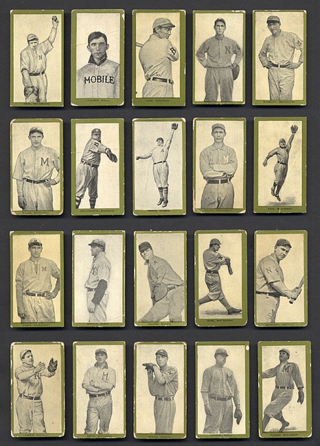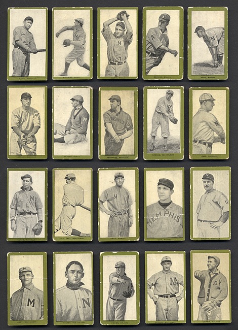 The T211 set is comprised of seventy-five different players from the Southern Association. T211 Red Sun are one of the rarest and (in large part because of their rarity) most overlooked of all tobacco-card issues. They share the same designs as the eighth series of the 1910 T210 Old Mill set, which are universally recognized as among the rarest cards in the T210 set. While every card in this lot is much rarer than the T206 Wagner, we cannot help but note that one player in this collection of T211 cards is named "Wagner". This lot consists of the following: Allen, Anderson, Babb, Bartley, Bay, Bayliss, Berger, Bernhard, Bitroff, Breitenstein, Bronkie, Brooks, Cafalu, Case, Chappelle, Cohen, Cross, Daly, Davis, DeMontreville, E. DeMontreville, Dick, Dunn, Erloff, Fisher, Flood, Foster, Greminger, Gribbon, Griffin, Gygli, Hanks, Hart, Hess, Hickman, Hohnhorst, Huelsman, Jordan, Kane, Kelly, Kerwin, Keupper, LaFitte, Lindsay, Lynch, Manush, McCreery, Miller, Molesworth, Moran, Nolley, Paige, Pepe, Perdue, Pratt, Rhoton, Robertson, Rogers, Rohe, Seabough, Seitz, Siegle, Smith, Sid Smith, Steele, Swacina, Sweeney, Thomas, Vinson, Wagner, Walker, Welf, Wilder, and Wiseman. T211 Red Sun Tobacco cards are among a small selection of elite sets that have long captured the imagination of many of the most legendary collectors, from the earliest days of serious collecting, perhaps more so in years past than even in recent times. The reason many great early collectors prized these cards so highly is twofold: 1) These cards could not (and cannot) simply be purchased in set form. They are rare! They have to be collected. They are a challenge. 2) Ultimately, cards are about the players that are featured. Many of the players in T211 are featured in few or no other sets. These characteristics make the green-bordered T211 Red Sun set especially significant to the game of baseball and to the world of baseball cards, and especially appealing to the most sophisticated collectors. T211 Red Sun cards also have a very distinctive design with striking player poses, and a very attractive and unique advertising back design. This set (minus one card) has been locked away in the collection of one of the hobby's great pioneer collectors (who passed away in 2009) for decades. It has always been one of the most extraordinary and rare prize sets of his collection and is being offered by his family. Total: 74 cards. Reserve $5,000. Estimate (open). SOLD FOR $88,125