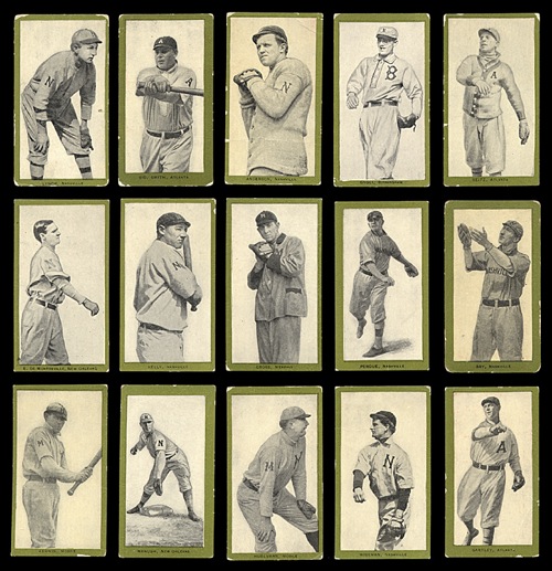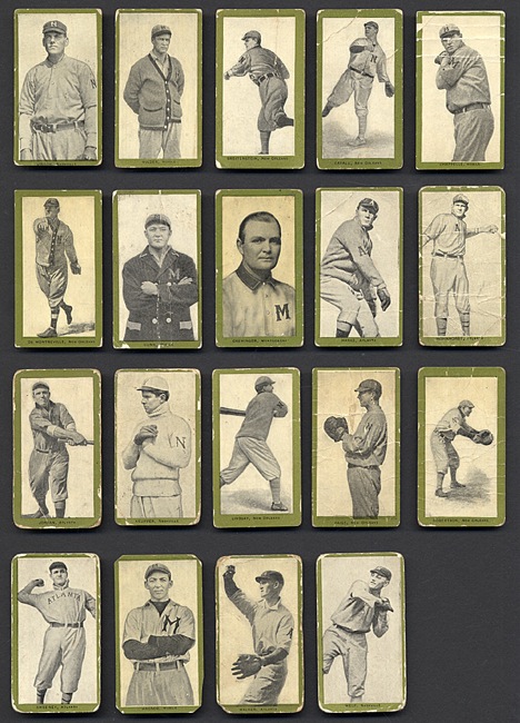 Complete set (minus 1) of 1910 T211 Red Sun Tobacco cards. Missing only Fritz for completion. 12% grade Vg-Ex (includes a couple Ex), 65% range from Gd to Vg, and 23% are in slightly lesser grade. To the best of our knowledge, this is an unprecedented offering, at least in modern times! We have never even seen a set or near-set of T211 presented for sale or auction, and large collections or near-sets of this rare issue are virtually unheard of. (In fact, to the best of our knowledge, no one has ever completed the T211 Red Sun Tobacco set. With seventy-four of the seventy-five cards, of course, this collection is very close.) The seventy-four cards presented here represent more T211 Red Sun tobacco cards in total than we have handled in the past forty years, our entire history in the hobby. This is an incredible offering!