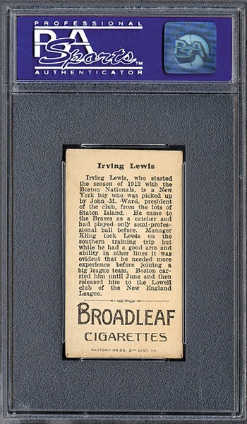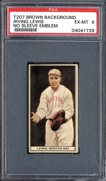 Graded EX-MT 6 by PSA. Highest-graded example! Presented is the highest-graded example of the rare Irving Lewis (no emblem on sleeve variation) card, one of the legendary rarities of tobacco-card collecting and one of the significant key rarities of the T207 Brown Background set. It is fascinating that there are two distinct varieties of Lewis, which is an extraordinary rarity in the T207 set in either form. In our experience, it appears that the "no emblem on sleeve" variety is the rarer of the two, and the PSA population report confirms this (five versus twelve). Today collectors recognize many cards as being of various degrees of rarity in the T207 set, but the rare Irving Lewis card (either variety) will always be recognized as one of the key rarities from the classic T207 set. Many advanced collectors consider Lewis even rarer than the famous Lowdermilk rarity. The card is bright and clean, both front and back, with light, even corner wear, and is centered to the top left (approximately 30/70 L/R and 40/60 T/B). Broadleaf Cigarettes advertisement on reverse. This is an extremely attractive high-grade example of this legendary T207 rarity. Reserve $2,500. Estimate (open). SOLD FOR $17,625