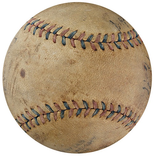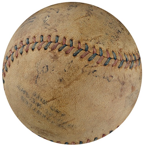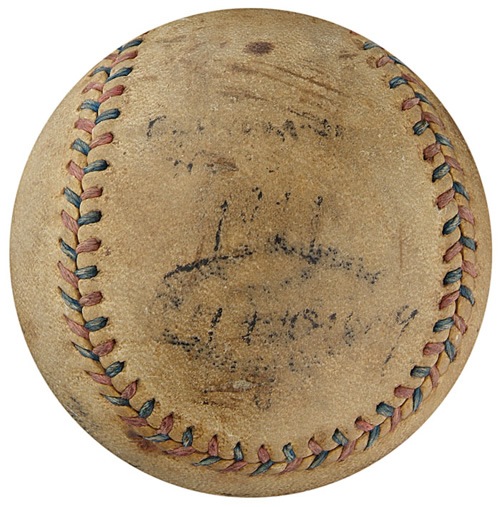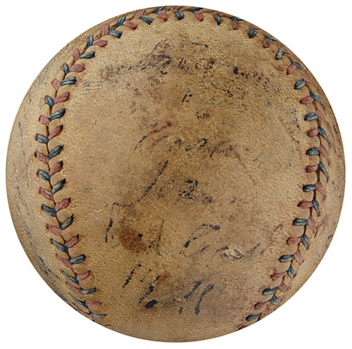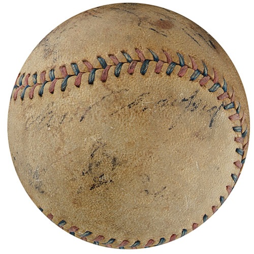 This red-and-blue stitched baseball (no manufacturer"™s name visible), dating from circa 1911, originally featured a multitude of signatures; however, all have long since faded beyond legibility with the exception of four: Joe Jackson, Ty Cobb, Sam Crawford, and Cy Young. Unfortunately, even those four are extremely faint (grading "1" by modern grading standards), with portions of each signature no longer visible. While all of the black fountain-pen signatures present here are highly prized by collectors, it is the signature of Joe Jackson that is the most significant. Jackson's signature is legendary for its great rarity, especially on baseball-related items. Jackson was a functional illiterate and although he was capable of signing his name if necessary, he normally avoided doing so if possible. (The difficulty he had in signing his name was a source of embarrassment for him throughout much of his early life.) That is why his signature today, when it can be found, is usually seen on legal or official documents that he had no choice but to sign. This ball represents a rare exception and is one of the few examples in the hobby today bearing his signature. Jackson"™s signature, which has been executed in black fountain pen, is the only one still visible on one side panel, although only badly faded fragments remain. The opposite side panel displays signature fragments of Ty Cobb and Sam Crawford. The remaining signature fragment visible on the ball is that of Cy Young on an adjacent side panel. If we assume that these ballplayers all signed this ball at the same time, then it was probably obtained in 1911, as that year corresponds both to Joe Jackson's first full season in the Majors and Cy Young's last. (Even though he was just a rookie in 1911 Jackson's signature would have been in high demand that season: he finished the year with a .408 average.) The ball displays moderate-to-heavy toning and soiling, with a few small areas of abrasion and slight discoloration. In Good condition overall.