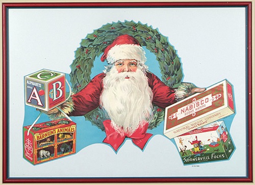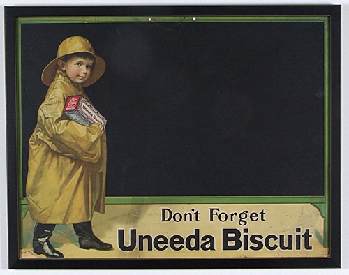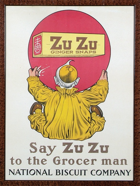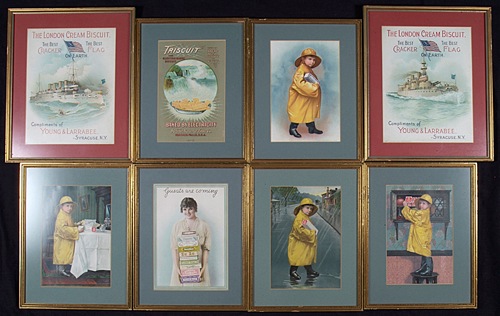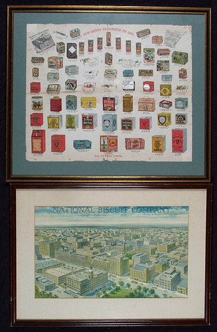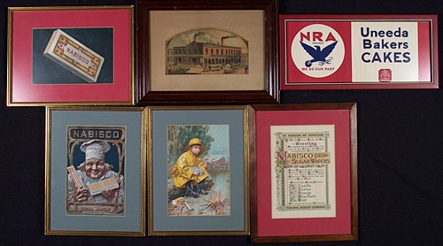 This diverse collection of twenty-one National Biscuit Company advertising pieces is comprised of magazine inserts, in-store displays, office displays, and even a few advertising pieces issued by bakeries that later become part of the National Biscuit Company corporate family. All of these pieces, most of which date from the early 1900s, originate directly from the company's archives and, as such, remain in near-pristine condition (with just a few noted exceptions). Each piece has been either framed or matted and framed to slightly larger dimensions. (The largest frame measures 38 x 26 inches; the smallest 17 x 8 inches.) This is a uniquely interesting and rare assortment of turn-of-the-century advertising displays relating to one of the most well known brand names in the history of marketing and American business. The archives of the National Biscuit Company were sold by REA in 2007, and these extraordinary American advertising items have been consigned to this auction directly from the gentleman who purchased them at that auction. INSERTS: N.B.C. was one of the first companies to place color advertising in magazines. They did so by producing full-color lithographs, printed on cardboard sheets, which were then inserted into prominent national magazines such as Scribner's . Technically these are referred to as "inserts" and they were, literally, tipped or inserted in the magazine. Offered here are nine such magazine inserts, each measuring approximately 6.5 x 9 inches. Five of the inserts feature the company's famous trademark image, "The Uneeda Boy," three promote "Sugar Wafers," and the last advertises an assortment of Nabisco products. Each insert has been matted and framed to approximate dimensions of 10.5 x 14 inches. IN-STORE DISPLAYS: 1) 1918 die-cut holiday display piece (approximately 25 x 17 inches) featuring an image of Santa Clause holding a group of N.B.C. products. It is interesting to note that one of the items Santa is holding is a box of Animal Crackers. When the company first introduced Animal Crackers they were a seasonal treat and the reason the box came with a string is that it was intended for use as a Christmas tree decoration. 2) Circa 1910 advertising display for Zu Zu Ginger Snaps. The display features Zu Zu the clown, another of the company's early and very well known trademark images. The piece (17 x 23 inches), which is dry mounted to a cardboard backing, does not display any fold lines, but has two small vertical tears extending down from the top border. Both tears have been effectively ameliorated by the mounting process and the display is otherwise in Excellent condition. 3) Circa 1918 National Biscuit Company advertising poster picturing over forty varieties of backed goods including Animal Crackers and Mallomars. This is an extraordinary piece for display and one of the highlights of this lot. Bright, crisp, and clean. The poster (36 x 24 inches), which has been dry mounted, displays both horizontal and vertical folds (as issued) upon close inspection as well a few additional creases and small tears (nearly all of which have been ameliorated by the mounting process). The piece is technically in Very Good condition but displays as Excellent. 4) Circa 1890 advertising poster issued by The New York Biscuit Company. The poster pictures over sixty varieties of biscuit tins offered by the company under a number of different brand names. The New York Biscuit Company was one of the baking companies that merged to create the National Biscuit Company in 1898. The poster (20.5 x 17 inches) has been mounted. There are small tears along both the vertical and horizontal fold lines, as well as a few additional tears (resulting in paper loss) and creases. Good condition. Despite technical flaws, the integrity of the poster remains. 5) Circa 1905 National Biscuit Company store display featuring the company's trademark "Uneeda Boy." The display reads "A Variety of National Biscuit Company Products sold here" and pictures a tin of Lorna Doone cookies. The piece (9.75 x 36.5 inches) displays three moderate horizontal folds (as issued) as well as a few light creases. In Very Good to Excellent condition. 6) Circa 1910 "Uneeda Boy" display (20.5 x 16 inches) in the form of a "blackboard" upon which the grocer could write in his specials. Heavy restoration to a number of large tears along the base; Good condition overall. 7) Circa 1935 NRA/N.B.C. banner (15.5 x 6.5 inches). OFFICE DISPLAYS: This piece, which was created for display in the NBC offices, features an illustration of the company's hundreds of plants laid out in the design of a large metropolis (19 x 11.5 inches). BAKERY ADVERTISING PIECES: Four advertising displays issued by baking companies that were later purchased by N.B.C. Two were issued circa 1898 by the Young & Larrabee company and promote their "London Cream Biscuit." Each display (8.5 x 11 inches) also features an illustration of a different U.S. battleship. The third piece is a circa 1903 advertisement (6.25 x 9.5 inches) by The Natural Food Company of Niagara Falls, in which it touts Triscuit biscuit, "Baked by Electricity." The final piece (9 x 5 inches) was issued by the F. L. Sommer and Co. Steam Bakery, circa 1895, and pictures its factory (minor restoration to a few small tears). Please note: due to the size and/or number of framed items in this collection, the shipping charges for this lot (depending on where it is sent and method of shipping) may be substantial. Total: 21 framed display pieces. Reserve $500. Estimate $1,000/$2,000.