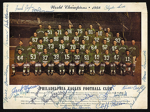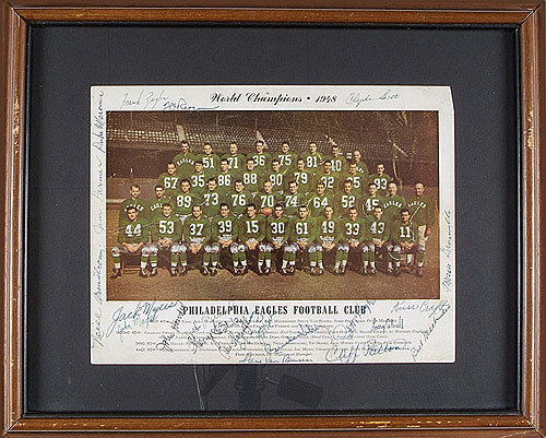Original 1948 World Champions Philadelphia Eagles official team photo, signed in blue ink along the white border areas by the following fifteen team members: Steve Van Buren, Alex Wojciechowicz, Neill Armstrong, Jim Parmer, Duke Maronic, Mario Giannelli, Russ Craft, Bill Mackrides, Pat McHugh, Cliff Patton, Bucko Kilroy, Joe Muha, George Savitsky, Jack Ferrante, and John Magee. This piece was obviously signed the following season, as it includes the signatures of six others, including three members of the 1949 World Champion Philadelphia Eagles: Clyde Scott, Frank Ziegler, and Frank Reagan. Signatures range from "6" to "10," averaging "9." The photograph (11.5 x 8.5 inches) has a slight trim to the borders, a single tack hole in the top border, a one-inch vertical tear in the bottom border, and moderate creases throughout, none of which affects the integrity of the piece or significantly detracts from its extremely impressive display value. Mounted and framed to total dimensions of 17.5 x 14 inches. LOA from James Spence/JSA. Reserve $200. Estimate $400+. SOLD FOR $529