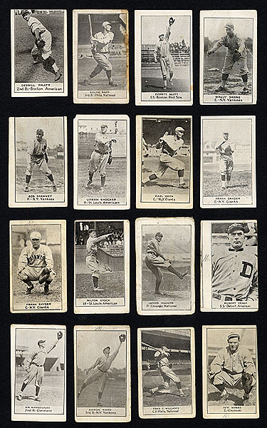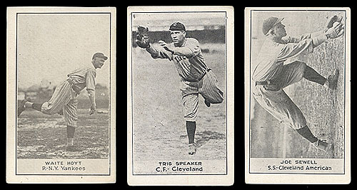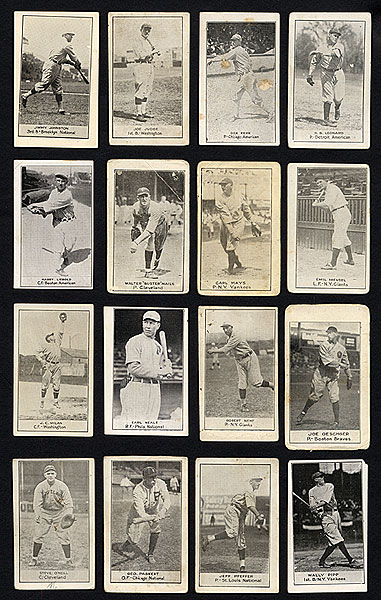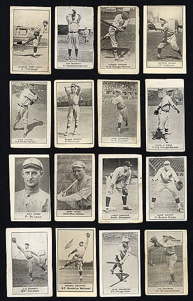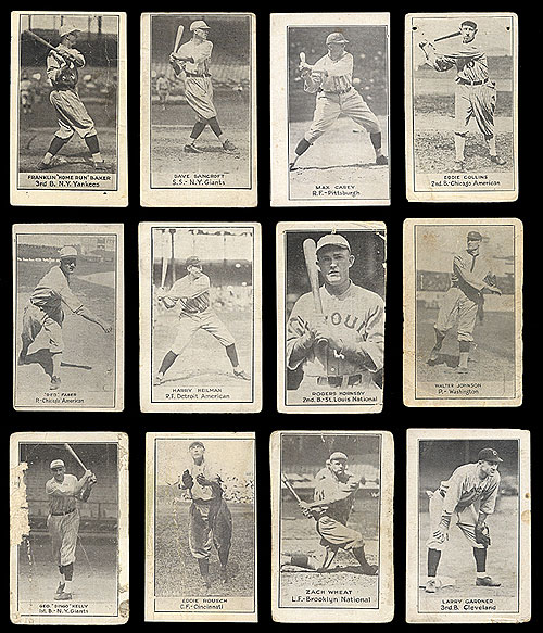 Collection of seventy-two different (of the 120 in the set) E220 National Caramel cards, including sixteen Hall of Famers, highlighted by Walter Johnson, Tris Speaker, and Rogers Hornsby. The E220 set is sometimes confused with the American Caramel issues of the early 1920s, but the advertisement for "National Caramel" on the reverse easily identifies the series. In fact, half the photos used to produce the E220s are identical to those used in several American Caramel sets. This is a mixed-grade collection (which is par for the course when dealing with E220s) with condition technically ranging from Poor to Vg-Ex/Ex (averaging approximately Good). This is a great-looking group. E220s are much rarer than most other similarly designed sets of the era (such as E121), and for some reason (as anyone who collects the set already knows) they are rarely seen in anything approaching high grade, and very often have slightly irregular cuts. That's just how they were made. Even the lowest-grade cards in this group are well worth having. Highlights: Baker (Fr), Bancroft (Gd-Vg), Carey (Vg), Collins (Pr), Faber (Vg/Vg-Ex), Heilmann (Vg-Ex), Hornsby (irregular cut, otherwise Pr), Hoyt (irregular cut, otherwise Ex), Johnson (Fr), Kelly (Pr), Maranville (Gd), Roush (irregular cut, otherwise Fr), Sewell (Vg/Vg-Ex), Sisler (Gd), Speaker (Vg/Vg-Ex), and Wheat (Pr-Fr). These cards have been consigned by the family of one of the hobby's great pioneer collectors who was an active and advanced collector for decades. Overall the condition of this collection is technically modest, but to the true collector, this is a very exciting group. This collection represents a tremendous start toward the assembly of a set and is the largest group we can ever recall offering. Includes sixteen Hall of Famers. Total: 72 cards. Reserve $500. Estimate $1,000+. SOLD FOR $3,819