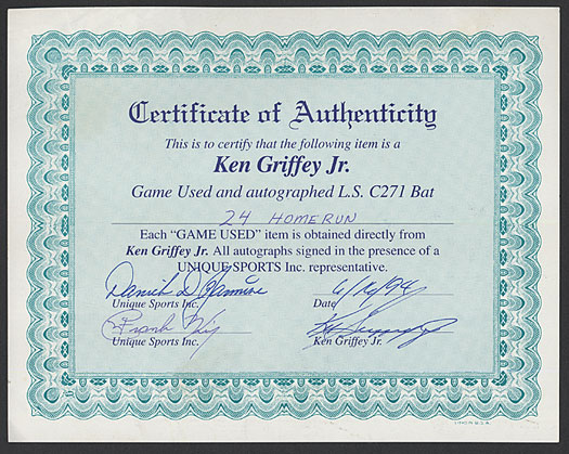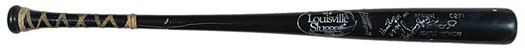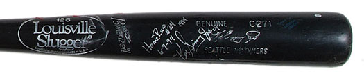 Ken Griffey Jr. Louisville Slugger signature-model ("C271") bat used by Griffey to hit his twenty-fourth home run of the season in 1994. The provenance for this bat is provided directly by Griffey, who has inscribed the bat and also signed a certificate of authenticity issued by Unique Sports Inc. Griffey's inscription, executed in silver paint pen on the "sweet spot" of the barrel, reads "Home Run #24/6-7-94/Ken Griffey Jr. #24" (with the second number "24" referencing his uniform number). As Griffey noted, his twenty-fourth home run of the 1994 season, which was also his 156th career home run, took place on June 7th at the Kingdome in Seattle in a game against the Cleveland Indians. The home run, a two-run blast to center field with one man on, came at the expense of Indians starter Dennis Martinez and gave Seattle a 5-4 lead at the time. Seattle went on to win the game 9-5. The bat displays heavy use along its entire length, including numerous deeply embedded ball and stitch marks (with ink transfers), a ten-inch "H" crack halfway up the handle, and an eight-inch-long application of tape, applied in a crisscross pattern, extending upward from the base of the knob. The bat also displays a few minor chips to the black finish. Griffey finished the 1994 season with a league-leading 40 home runs, 90 RBI, and a .323 average. Those numbers helped him finish second in the MVP balloting behind Frank Thomas. Griffey retired in 2010 as one of only nine players in history to amass 600 or more home runs, with his total of 630 ranking fifth all-time heading into the 2012 season. This is an exceptional, personally documented Griffey Jr. home-run bat dating from early in his soon-to-be Hall of Fame career. Length: 34 inches. Weight: 30.6 ounces. LOA from James Spence/JSA and Ken Griffey Jr./Unique Sports Inc. Reserve $500. Estimate $1,000/$2,000. SOLD FOR $2,963