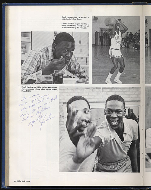 Two Laney High School (Wilmington, North Carolina) Spinnaker yearbooks, dating from 1980 and 1981, respectively, that correspond to Michael Jordan's junior, and senior years at the school. Ideally, both books have been inscribed by Jordan to one of his classmates. Also accompanying the two signed yearbooks is a second junior yearbook that is not signed, for a total of three yearbooks. 1) Jordan has inscribed the junior yearbook in blue ink (grading "10') on page 167, located just to the right of an action photo of him dunking a basketball: "To a very nice young lady who meant a lot to me. See you in the future. Love Michael Jordan." The name of the original owner of the book, "Gwen Dolyn Taylor," is written in ink on the interior front cover (Taylor was a member of Jordan's junior class). 2) The senior yearbook is inscribed in blue ink (grading "10") on page 202, just to the left of a photo of Jordan and his high-school coach posing together: "To a very nice young man who supported me during the season. Good luck in the future. Michael Jordan." This yearbook originally belonged to one of Jordan's classmates named "Joey." Both yearbooks picture Jordan more than once, including his respective class portrait, and each features inscriptions by numerous other classmates. 3) As noted, also included is a second 1980 junior yearbook that has not been signed by Jordan. All of the yearbooks display moderate handling wear and are in Excellent condition overall. Celebrity high-school yearbooks have become an extremely popular area of collecting in recent years, and these may be the most desirable examples from the world of basketball. Total: 3 yearbooks (senior yearbook signed by Michael Jordan, and two junior yearbooks, one of which is singed by Michael Jordan). LOA from James Spence/JSA. Reserve $500. Estimate $2,000+.