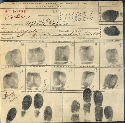 The official "Department of Public Safety, Philadelphia, PA. Bureau of Police" fingerprint card has been signed by "Alphonse Capone" in black fountain pen, with the signature grading "10." Featured below his signature are Capone's individual finger prints as well as prints of his four left and four right fingers together. The front of the card also contains a number of official handwritten police notations, including Capone's residence ("Chicago, Ill"), occupation ("Real Estate"), the name of the recording officer, and the date ("5-17-29"). The reverse of the card includes Capone's vital statistics (Height: 5-11 1/4"; Weight: 252; Age: 30) along with the name of the arresting officer, the official charge, and the date. On the date this card was processed ("5-17-29") Capone was sentenced to serve one year in prison for carrying a concealed weapon. According to legend, what made that crime (and Capone's capture) all the more extraordinary was that the entire affair was arranged by Capone himself.