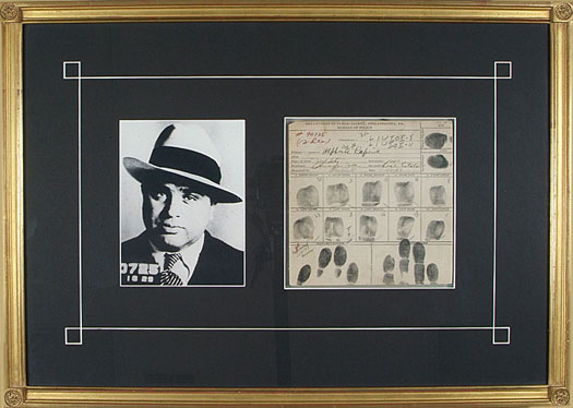 The fingerprint card (8 x 8 inches) displays a heavy vertical fold that runs from border to border as well as a few other minor creases. Two tears are present along the center fold. The first measures 1.5 inches and extends from the top border, while the other, measuring 2.5 inches, extends from the bottom border. Both the center crease and a minute portion of the top tear touch upon the "p" and "o" in "Capone", but neither significantly detracts from its perfect appearance. A few additional tiny edge tears, and a small chip in the upper left corner are also evident. In Very Good condition overall. Matted and framed together with a recent print of Capone to total dimensions of 28 x 20 inches. Ideally, the card has been framed with glass on each side, so that both its front and reverse can be viewed. LOA from James Spence/JSA. Reserve $10,000. Estimate (open). SOLD FOR $53,325