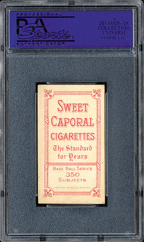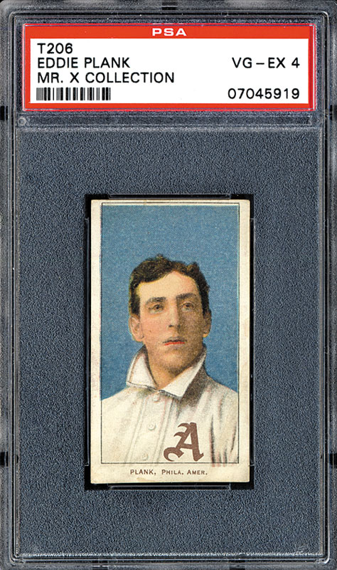 Addendum: It has been brought to our attention that in the opinion of some collectors the cut along the bottom border of this T206 Plank is consistent with the card having a very slight trim. They may be correct. We can"™t say with certainty that the card is trimmed, it may not be, but after careful examination, we do think this is a possibility. It has also been brought to our attention that many years ago this card resided in a PSA VG 3 holder. While by policy Robert Edward Auctions does not submit cards for regrading (we don"™t think that is our role), it is a common practice by many collectors and dealers and comes with the territory with graded cards. Sometimes the same card can get graded differently at different times. In addition, sometimes a card that is deemed particularly strong for the grade can be submitted for review and get bumped a grade. (And who knows how much pull the famous and mysterious "Mr. X" had!) The following is a link to a 2005 article from the PSA website about the "Mr. X Collection": http://www.psacard.com/articles/article_view.chtml?artid=4391 While the entire collection was promoted as "The Mr. X Collection" from this article it appears that only the Plank and the Magie cards were actually noted on the PSA labels as from the "Mr. X Collection." Graded VG-EX 4 by PSA. Superb high-grade example of T206 Eddie Plank, one of card collecting's most legendary rarities. "Wagner, Plank, and Lajoie" are the three baseball card rarities that have long been referred to as "The Big Three." These three baseball cards, Wagner and Plank from the T206 series, and Nap Lajoie from 1933 Goudey, have traditionally represented the height of rarity, desirability, and value in the baseball card world. When Jefferson Burdick first published the American Card Catalog in the 1930s, the T206 Wagner was listed as the most valuable baseball card in the world at a then-incredible $50. Plank was the second most valuable card, listed at $10. Over the years, since the days of Jefferson Burdick, other cards have come to be universally recognized as among collecting's most desirable cards, but "Wagner, Plank, and Lajoie" will always be the inaugural members of this elite club, and the three cards that purists among baseball-card collectors will always recognize as the ultimate symbols of rarity and desirability. The reasons for the great rarity of Plank are shrouded in mystery. One popular explanation that appears to have no basis in fact is that the printing plate broke. It is far more likely that Plank objected to having his picture packaged with cigarettes. Like Wagner, Plank is in all the candy-card sets of the era but does not appear in any of the primary tobacco-card sets issued during this same period, such as T3, T201, T202, T205, or T207. Since Plank was one of the greatest stars of the day, it is unlikely that the tobacco companies simply forgot to put him in all these sets. It is far more likely that there is a common explanation. This is a magnificent example of T206 Plank, bright and clean, with bold colors, a hint of wear to the corners, just the lightest hint of a surface crease (barely detectable only under bright light), and a slightly out-of-registry image. Centered to the top border. This is a strong Vg-Ex card which in the "old days" would have been called Ex. It is particularly rare to find such a problem-free example of this card. Like all T206s, including Wagner, a very large percentage survive in lower grades, and very few in higher grades. Among the more common cards in the set, which include virtually all, the law of averages allows for a much greater possibility of a given card being found in high grade, but the pool of survivors of the extreme rarities such as Wagner and Plank make high-grade examples far rarer and more desirable than a simple numerical grade might suggest. The "Mr. X Collection" designation was the amusing pedigree that was famously assigned to the label of every card of a T206 set (missing only Wagner and the rare Doyle) graded by PSA for the mysterious "Mr. X" in 2005. All that was ever revealed about "Mr. X" was that he was very famous and that he was in show business. To this day, we have no idea who "Mr. X" is or was, but we do know that he did a great job of assembling an extremely high quality T206 set. The entire set was sold individually on eBay. Every once in a while a card from this collection surfaces. This Plank card was the crown jewel of the "Mr. X" collection. The reverse is bright and clean and features an advertisement for Sweet Caporal Cigarettes (350 Subjects, Factory No. 30). This is a very attractive example of T206 Eddie Plank, one of card collecting's greatest and most sought after rarities. SMR value for the assigned grade is $85,000. Reserve $25,000. Estimate $50,000+. SOLD FOR $56,288