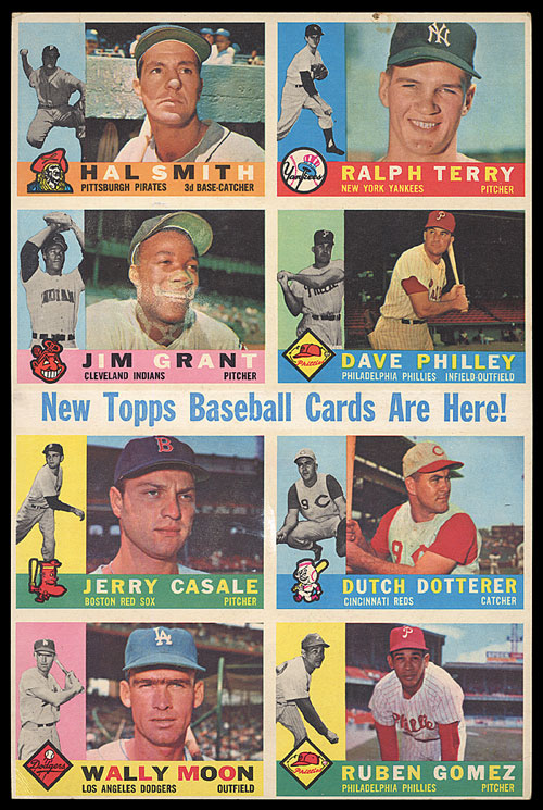 Extremely rare eight-card advertising panel for the 1960 Topps baseball series featuring cards #5 Moon, 14 Grant, 21 Dotterer, 38 Casale, 48 Smith, 52 Philley, 82 Gomez, and 96 Terry on the front and a blank-back. The advertising in the center reads "New Topps Baseball Cards Are Here! For many years (beginning in 1952 and continuing well into the 1960s), uncut advertising panels were distributed by Topps to grocers and candy-store owners for the purpose of announcing and providing samples of the new cards being offered. Almost all were three-card panels, but the unusual style of this 1960 advertising sample sheet with eight cards is a rare (actually unique) exception (1960 is the only year for which we have ever seen an eight-card advertising panel style). Because of their method of issue and purpose, all Topps advertising panels are rare. We have seen only three examples of this 1960 Topps advertising rarity during the past forty years. Some type of wear or printing flaw affects Jim Grant's card. Very Good condition. Dimensions: 7 x 10.5 inches. Reserve $200. Estimate (open).