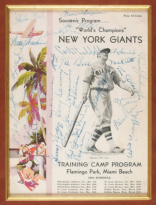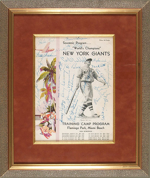 1934 New York Giants spring-training program signed on the cover in blue fountain pen by twenty-nine team members, including Ott, Terry, Hubbell, Jackson, O'Doul, Critz, Vergaz, Watkins, Moore, Mancuso, Ryan, Danning, Weintraub, Thompson, Richards, Schumacher, Fitzsimmons, Parmalee, Luque, Bell, Salveson, Smith, Castleman, and Clark. The remaining five signatures on the program most likely belong to players who were in camp at the time but failed to make the final roster. All of the signatures have been boldly penned, grading "9" or "10," As noted in the printed text, the Giants were the defending World Champions in the spring of 1934 and with the exception of Kiddo Davis, all of the key players from the 1933 Championship club are represented here. The program displays modest handling wear and is in apparent Excellent condition. Matted and framed to total dimensions of 15 x 18 inches. LOA from James Spence/JSA. Reserve $200. Estimate $400/$800. SOLD FOR $948
