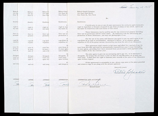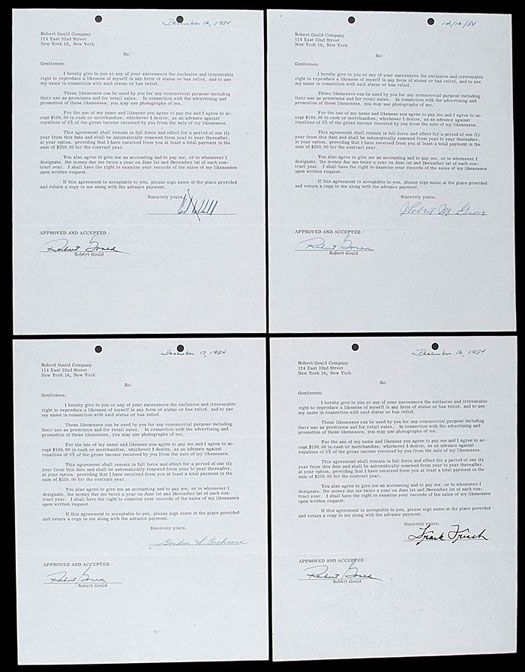 Collection of five one-page contracts, dating from either 1954 or 1955, between the Robert Gould Company and, respectively, Tris Speaker, Carl Hubbell, Mickey Cochrane, Lefty Grove, and Frankie Frisch. Each contract has been signed by the respective player in blue ink, with the exception of Frisch (black ink), and by Robert Gould as owner of the company. All of the signatures are boldly scripted and grade "10." These contracts, which are identical in wording, grant the Robert Gould Company and its successors the exclusive and irrevocable right to reproduce each player's likeness in any form of statue or bas relief and to use his name in connection with said statue or bas-relief. In exchange, each player would receive an advance of $100, in cash or merchandise, as an advance against royalties of 5% of the gross income received by the Robert Gould Company from the sale of his likeness. Furthermore, the agreement shall remain in full force and effect for a period of one year and shall be automatically renewed from year to year thereafter, at the company's option, provided that the player receives at least a total payment in the sum of $250 for the contract year. Interestingly, the Robert Gould Company did produce a set of twenty-eight plastic statues of various baseball players in 1955; however, none of the players represented here was included. (The set is officially known as the "1955 Robert Gould All-Stars Statues.") All of the issued statues were of then-current ballplayers. It appears very likely that a second series was planned featuring old timers. If so, it never came to fruition, leaving these contracts as the only tangible evidence of that non-issued series. Collectors may also be familiar with the cards (W605 - "1955 Robert Gould All Stars Cards") that accompanied the statues when issued. (The cards are actually more valuable, in part because the small plastic statues survive more easily than the cards. The 2011 Standard Catalog of Baseball Cards lists an aggregate price of $8,500 for the card set in Near Mint condition, and $1,500 for a complete Near Mint set of statues.) The contracts (7.5 x 9.5 inches) display two notebook holes along the top border, two horizontal fold lines, and a staple hole in the upper left corner. In Excellent condition overall. LOA from James Spence/JSA. Reserve $200. Estimate $400/$800. SOLD FOR $948