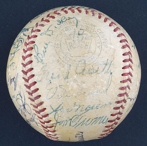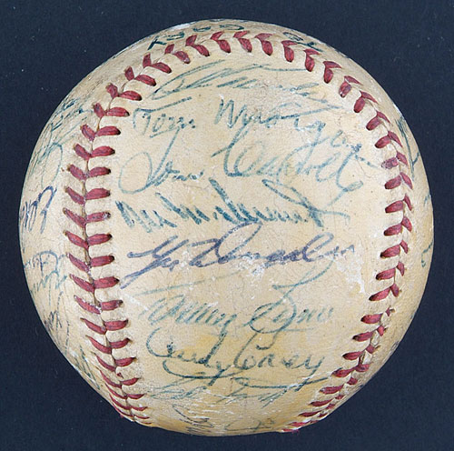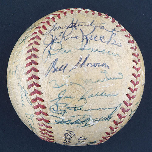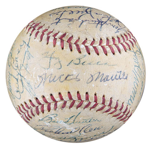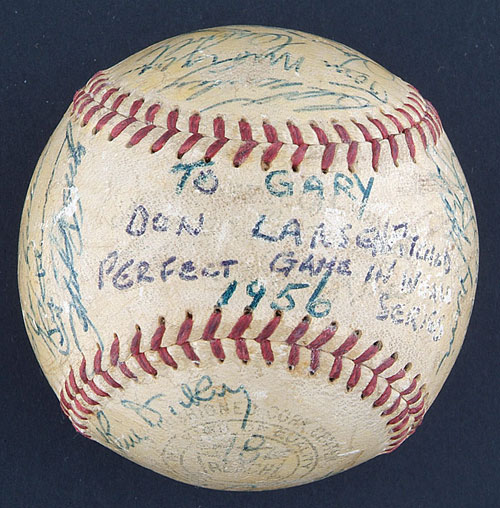 Official American League (Harridge) ball signed in varying shades of blue ink by the following twenty-nine members of the 1956 World Champion New York Yankees: Mantle (sweet spot), Berra (sweet spot), Ford, Rizzuto, Dickey (coach), Larsen, Martin, Sturdivant, Kucks, Skowron, Collins, R. Coleman, Grim, J. Coleman, Robinson, Silvera, Bauer, Cerv, Hunter, Crosetti (coach), Howard, Turner (coach), Noren, Turley, Morgan, Carroll, Byrne, Carey and one other (illegible). Signatures range from "3" to "8," averaging "7." Our consignor has always believed this to be a game-used baseball from Don Larsen's perfect game in the 1956 World Series, and he purchased it as such at public auction in 1991. That belief is based upon a vintage personalization and notation appearing on the ball label. The personalization, printed in blue ink, reads "To Gary/1956." Printed in between the salutation and the year, in a different shade of blue ink, is the notation "Don Larsen Pitched/Perfect Game in World/Series." Unfortunately, the fact that Eddie Robinson's name appears on this ball, probably makes its use in Larsen's perfect game impossible. The Yankees traded Robinson to the Kansas City Athletics on June 14, 1956; therefore, he would not have been in the clubhouse to sign this ball following Larsen's perfect game in the World Series later that year. Despite that fact, this ball can at least be traced back directly to Don Larsen. In examining a side panel, one can clearly see the number "18" written in vintage blue ink. Don Larsen wore number "18" in 1956. During that era, clubhouse attendants normally wrote the players' uniform numbers on balls, for inventory purposes, when team balls were lined up for signing for fellow players, other members of the Yankees organization, and special dignitaries. That way, the other players knew for whom the ball was being signed, and the attendants knew who to give it to afterwards. Given that fact, it may very well be Larsen who personalized the ball, with the "perfect game" notation added after the Series. Regardless, the ball remains notable for the number of signatures upon it and, most important, for the fact that it is free of any "clubhouse" examples, which are frequently found on balls from this era. The ball has been coated with a light layer of protective shellac and displays a number of minor abrasions throughout. The manufacturer's stampings are badly faded. In Very Good condition overall. LOA from James Spence/JSA. Reserve $400. Estimate $800/$1,200. SOLD FOR $1,185