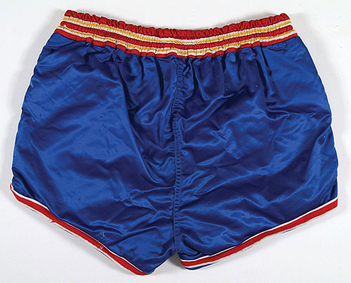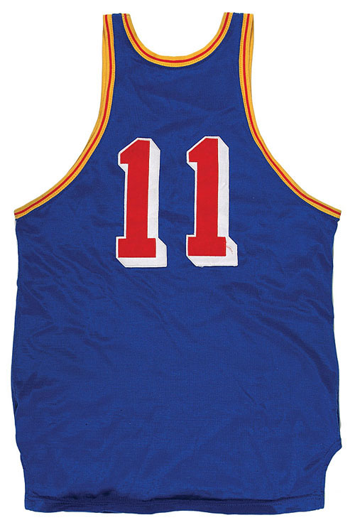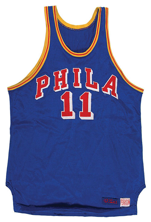 Philadelphia Warriors road jersey worn by Hall of Fame forward "Pitchin' Paul" Arizin during the 1961-1962 season. Graded A10 by MEARS. The blue dureen jersey is lettered "Phila" across the front and features the number "11" on the front and reverse. All letters and numerals are appliquéd in red on white tackle twill (shadowbox style). Located on the left front tail are a "Pearson" label and a blue strip tag bearing the size, uniform number, and year ("42 11 61") chain-stitched in red. Gold-and-red trim is featured along the collar and arm/shoulder openings. The jersey, which is original as issued, with no alterations, displays heavy wear throughout (consistent with a full season of use). Accompanying the jersey is a matching pair of 1961-1962 Philadelphia Warriors road shorts worn by Al Attles. The blue satin shorts feature a red-and-gold trim along the waistband, and a red-and-white trim along the leg openings. Located on one of the interior hip pads is a "Pearson" label, an adjacent "34" size tag, and a blue strip tag bearing the size, year, and uniform number ("34 61 16") chain-stitched in white (Attles wore number "16" during the 1961-1962 season). The shorts display heavy wear, including a number of small holes (possibly as a result of insect damage). The fact that the Attles' shorts accompany this jersey is related to its provenance. After the 1961-1962 season the Warriors moved from Philadelphia to San Francisco. At the time, a friend of our consignor's brother worked at the arena and asked if either of the brothers wanted any of the uniform items that were left as souvenirs. They said yes and, without specifying any particular player, they received this Arizin jersey and Attles shorts. Both the jersey and pants have been in our consignor's possession for the past fifty years!