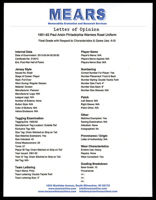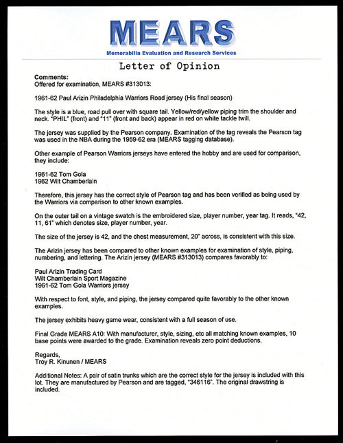 1961-1962 marked Arizin's final NBA season, mainly because he refused to relocate to San Francisco (he actually played three more seasons for the Camden Bullets of the Eastern Professional Basketball League). Although a ten-year veteran, Arizin still had his shooting touch in his last season, averaging 21.9 points per game during the 1961-1962 campaign. Arizin was one of the NBA's true pioneers, and he helped to usher in the modern game of basketball by introducing the jump shot. One of the most prolific scorers in NBA history, his career point total of 16,266 was third best in history at the time of his retirement. In addition to leading the Warriors to the 1956 NBA Championship, Arizin was also a ten-time All-Star and a three-time All NBA First Team selection. He was elected to the Basketball Hall of Fame in 1978, and in 1996 was named as one of the NBA's 50 Greatest Players. This is one of only a few Paul Arizin jerseys we have ever seen, not to mention the first we have ever handled, and with a perfect grade of A10 by MEARS it certainly ranks among the finest known. Given both its rarity and Arizin's importance in the history of the NBA, it represents a truly exceptional Hall of Fame jersey and one that would be among the highlights of any advanced basketball collection. LOA from Troy Kinunen/MEARS. Reserve $5,000. Estimate $10,000++. SOLD FOR $13,035.00